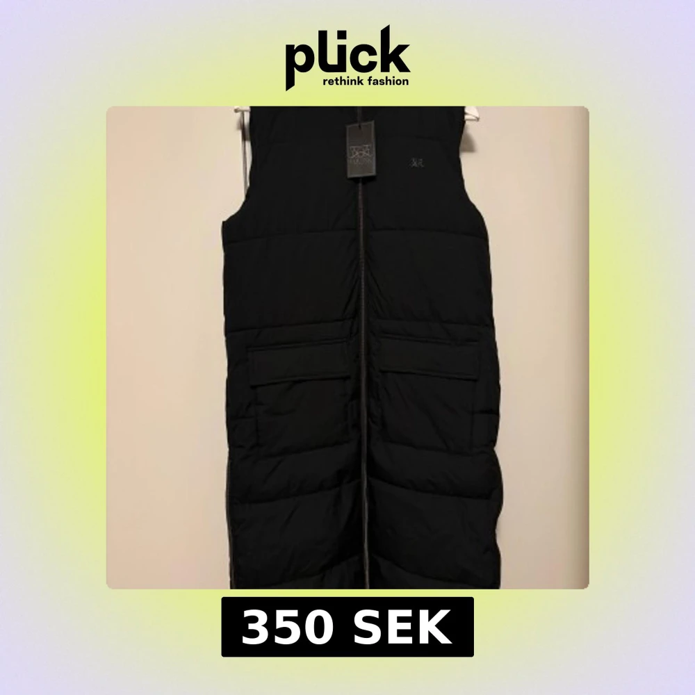 Snygg svart lång dunväst från Equine i storlek XS. Västen har huva, två stora fickor framtill och dragkedja hela vägen. Perfekt för lager-på-lager och har en stilren, quiltad look som funkar till många outfits.