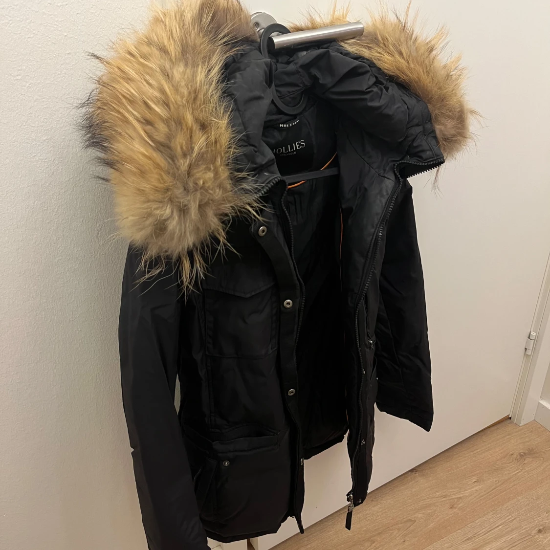 Snygg svart parkajacka från Hollies med stor pälsdetalj på huvan. Jackan har praktiska fickor och stängs med dragkedja och knappar. Perfekt för kyliga dagar.