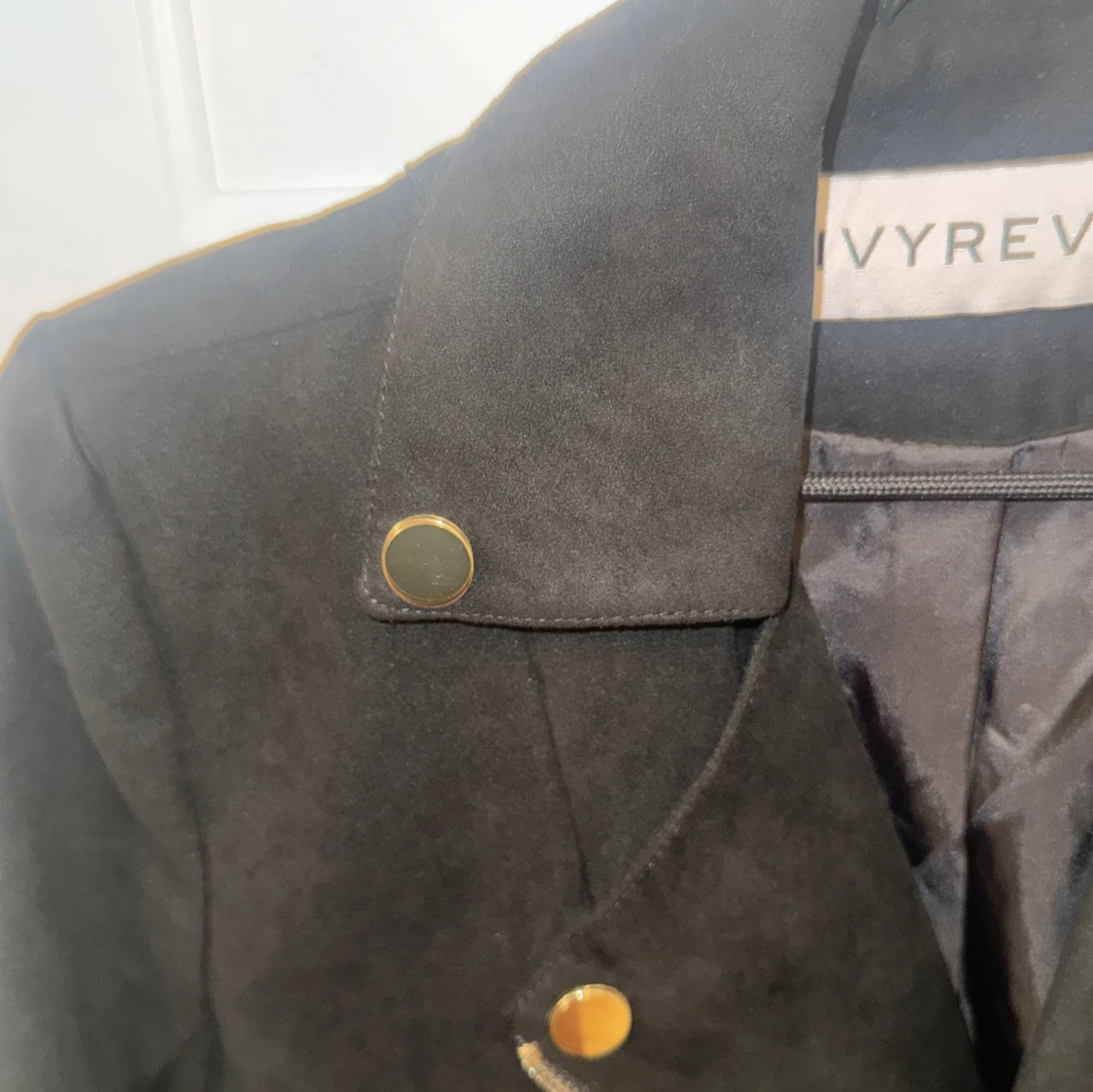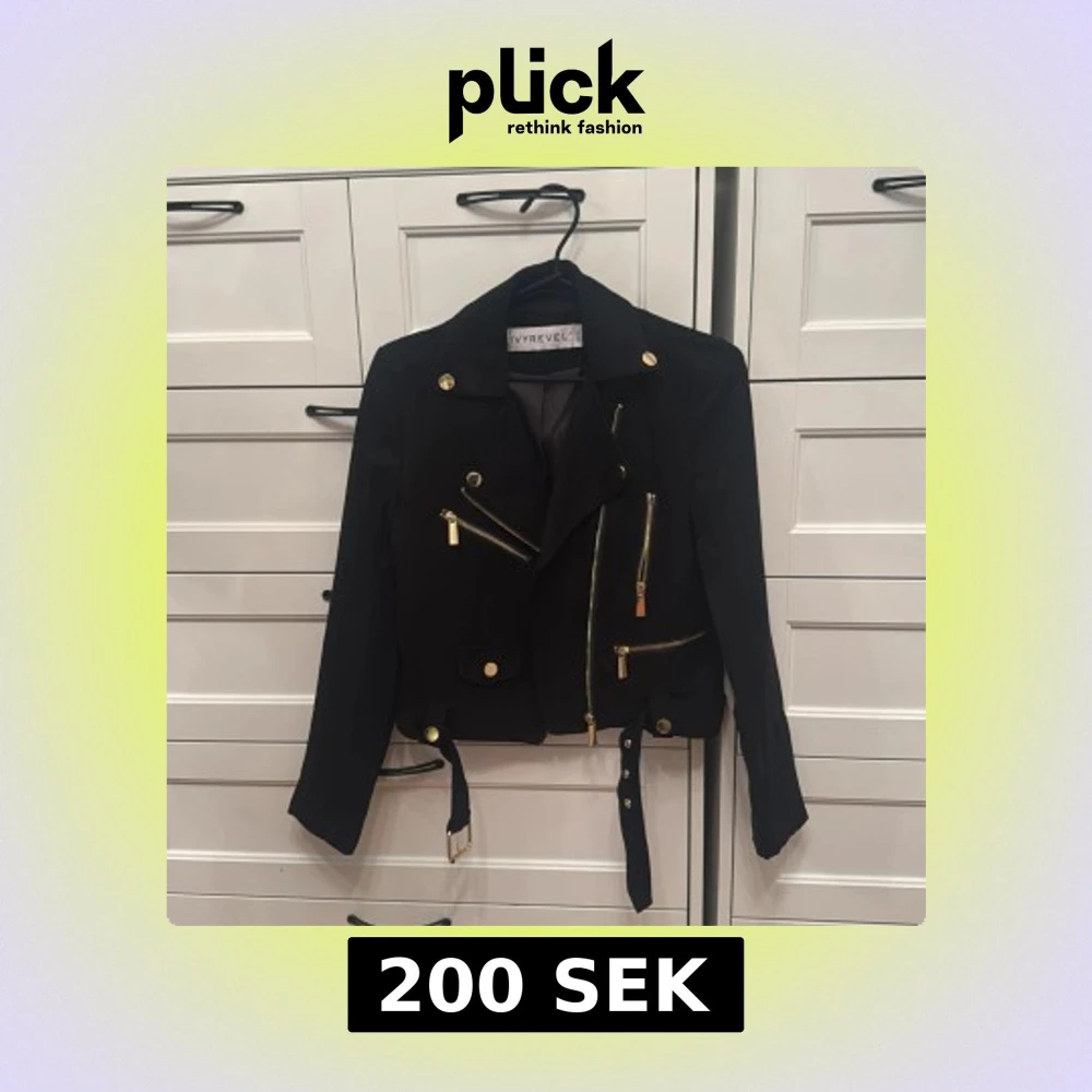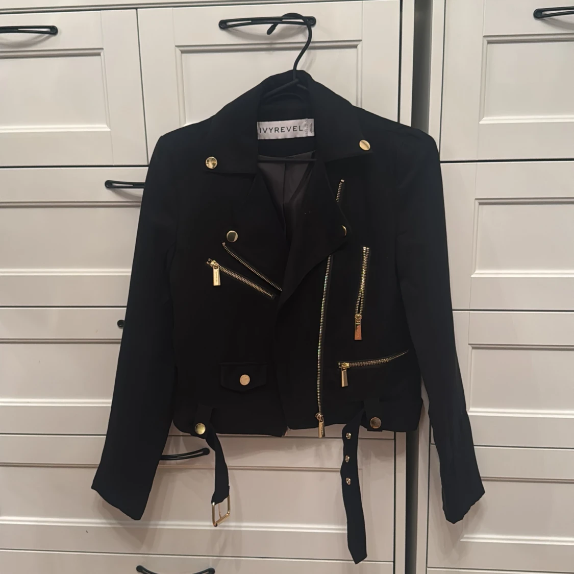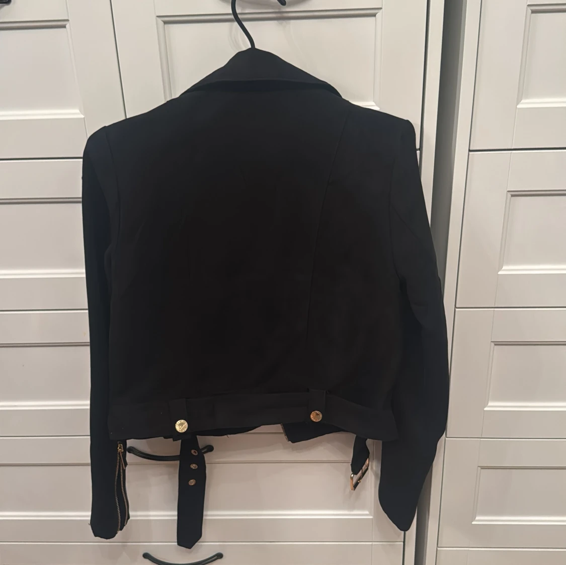 Snygg svart bikerjacka från Ivyrevel i mockaliknande material med guldiga detaljer, flera dragkedjor och bälte i midjan. Jackan är croppad och har långa ärmar samt coola knappar på kragen och vid ärmslut. Som ny!