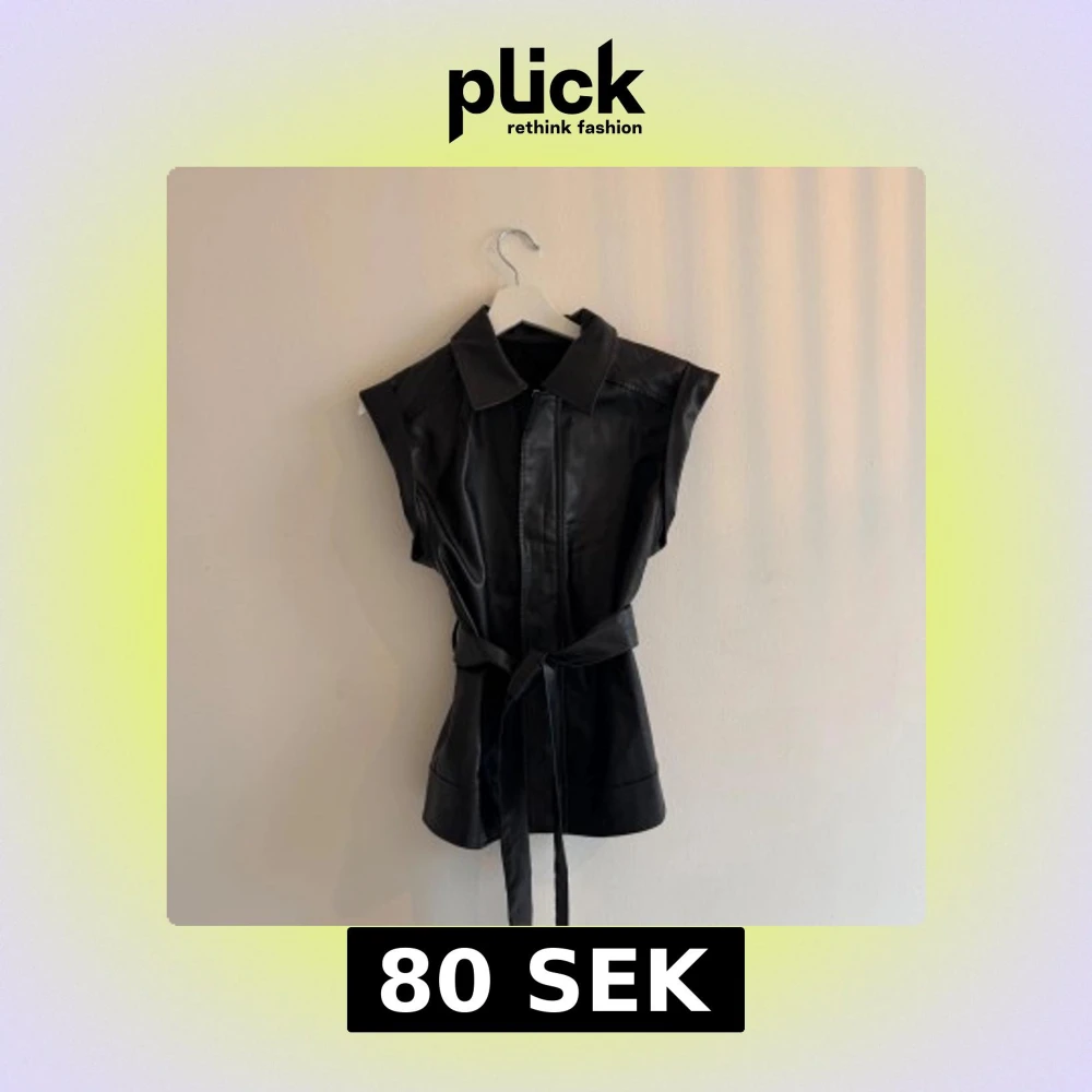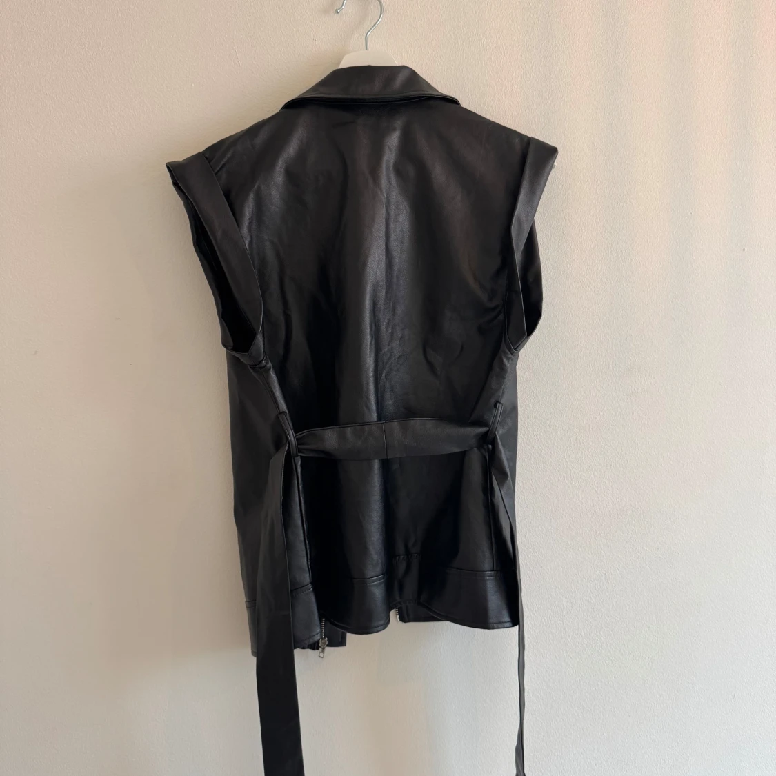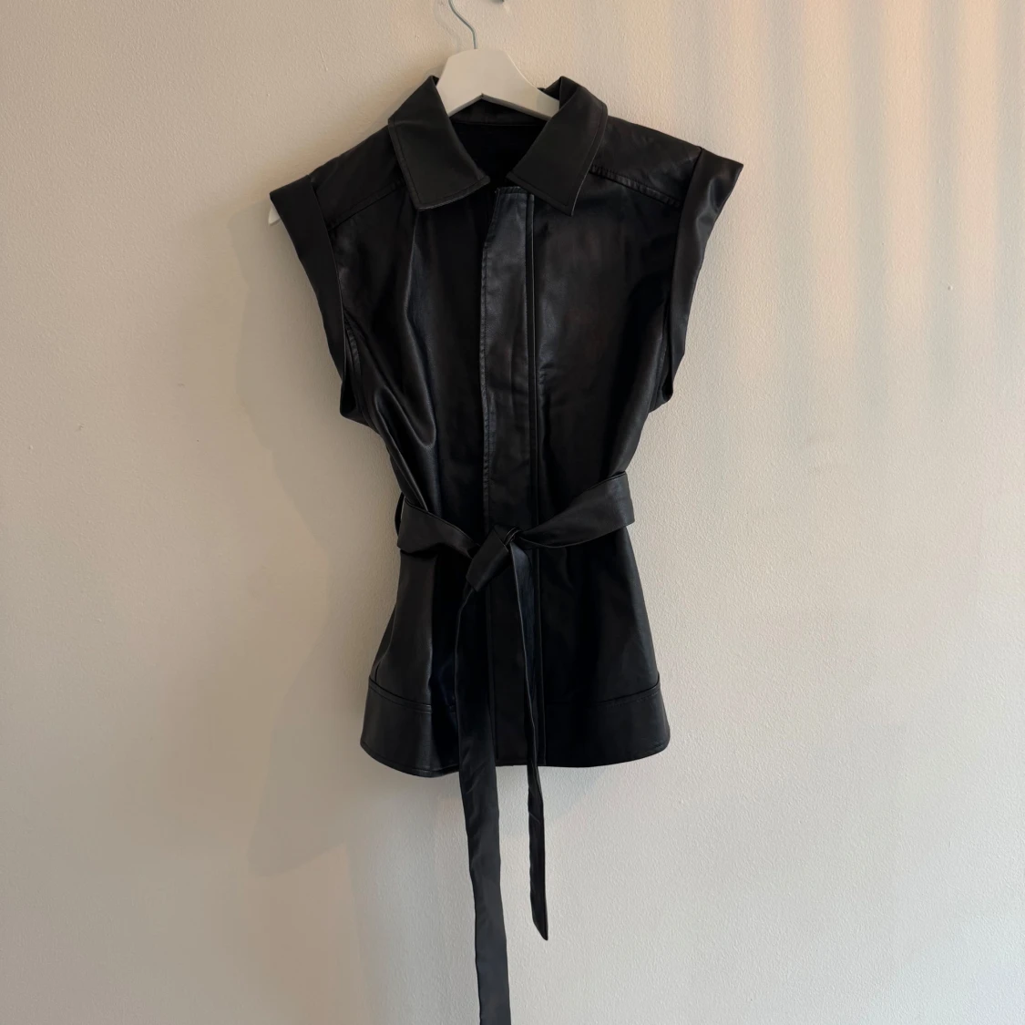 snygg väst i svart läderimitation. Den stängs med dragkedja framtill och har ett knytband i midjan som ger en fin och markerad siluett. OBS: Vet inte storlek men skulle uppskatta XS/S.