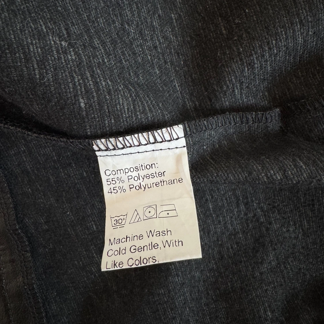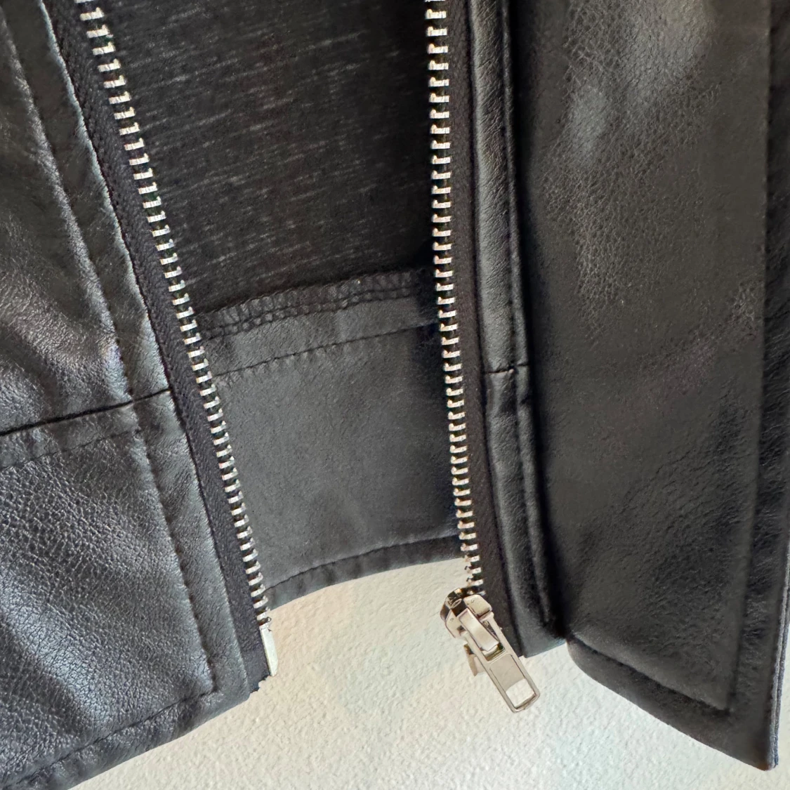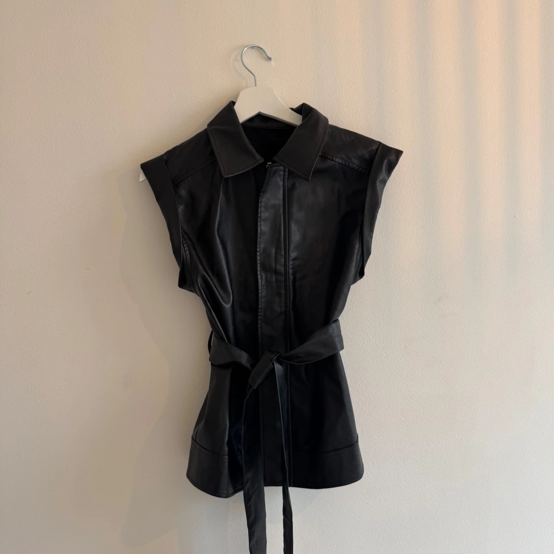snygg väst i svart läderimitation. Den stängs med dragkedja framtill och har ett knytband i midjan som ger en fin och markerad siluett. OBS: Vet inte storlek men skulle uppskatta XS/S.