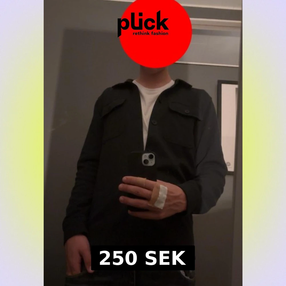 Säljer en svart overshirt med klassisk krage och två bröstfickor med knappar. Jackan har lång ärm och stängs med knappar framtill. Perfekt att slänga över en t-shirt för en clean och enkel look.