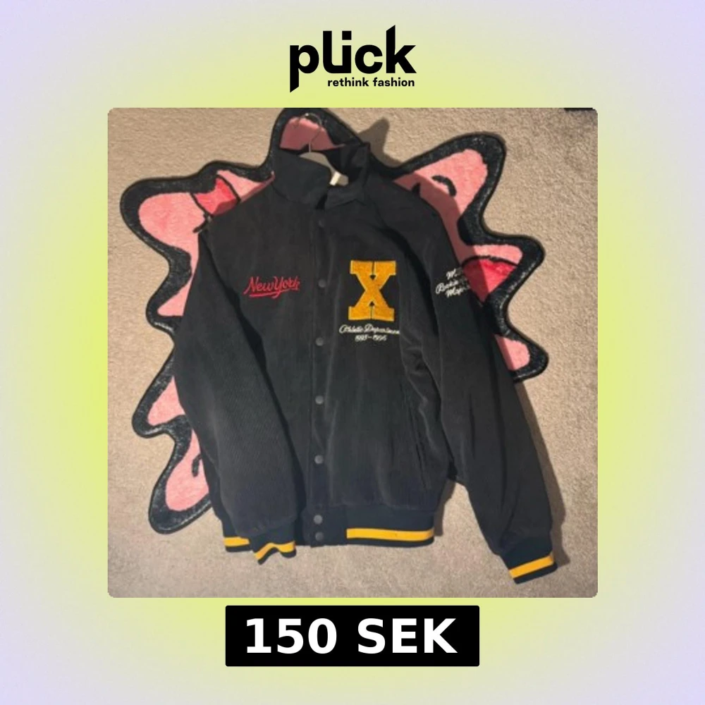 Snygg jacka med broderade detaljer. Jackan har en stor gul bokstav 'X' på bröstet och texten 'New York' i rött. Den har knappar framtill och ribbade muddar i svart och gult.