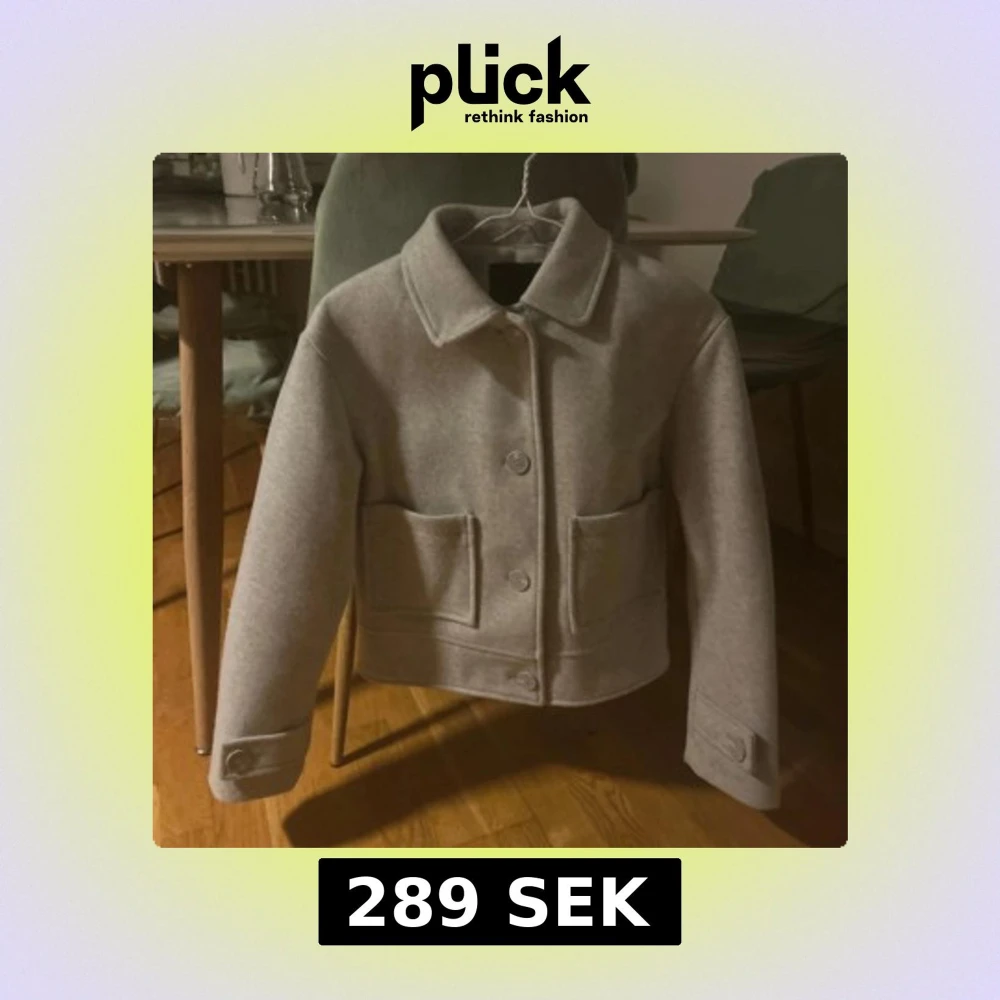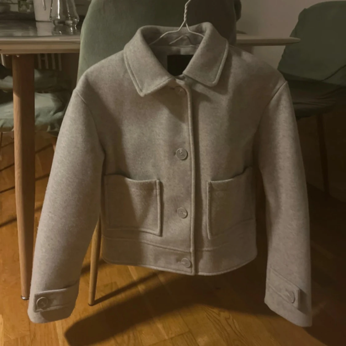 Snygg grå jacka i ull med klassisk krage och stora framfickor. Jackan har knäppning med stora knappar framtill och på ärmsluten. Rak och boxig passform som ger en modern look.