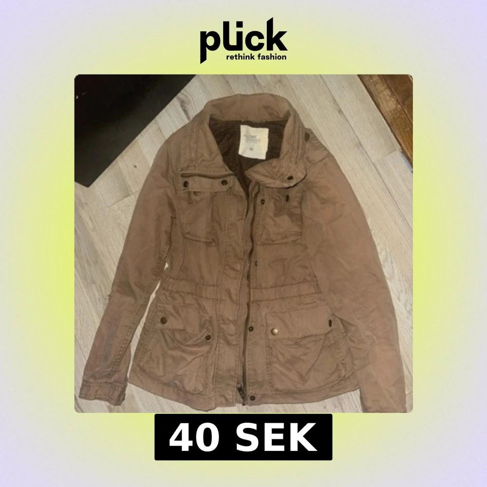 Säljer en beige parkajacka från H&M L.O.G.G. med flera fickor och snygga detaljer som knappar och dragkedja. Jackan har en hög krage och mönstrat innerfoder. Perfekt för dig som gillar en chill och praktisk stil.