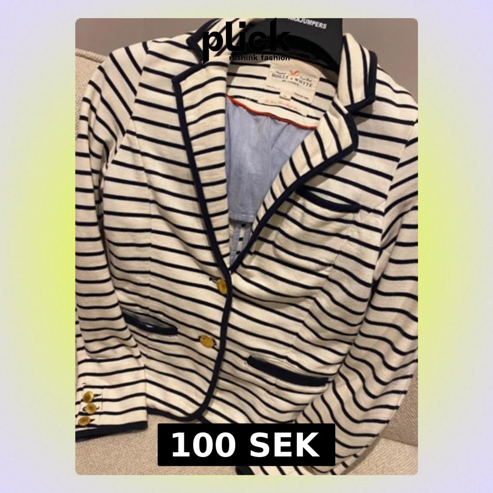 Säljer en snygg vit kavaj med marinblå ränder från Holly & Whyte. Kavajen har guldknappar, mörkblå detaljer vid fickor och krage samt figursydd passform. Tillverkad i mjuk bomull och har långa ärmar. Perfekt för en preppy look!