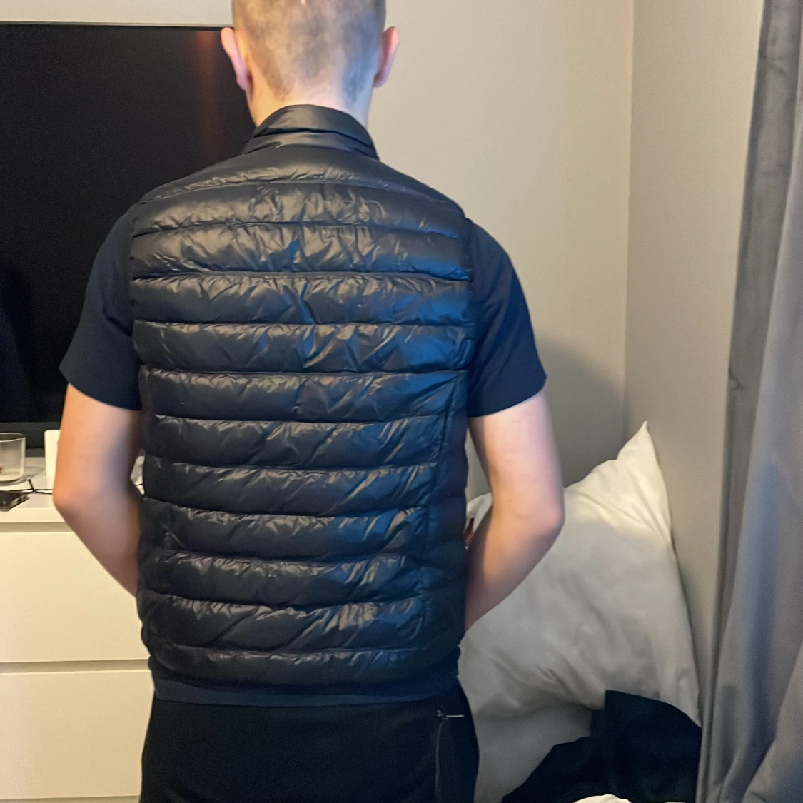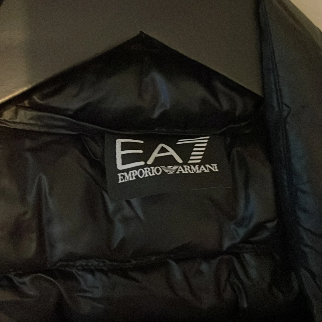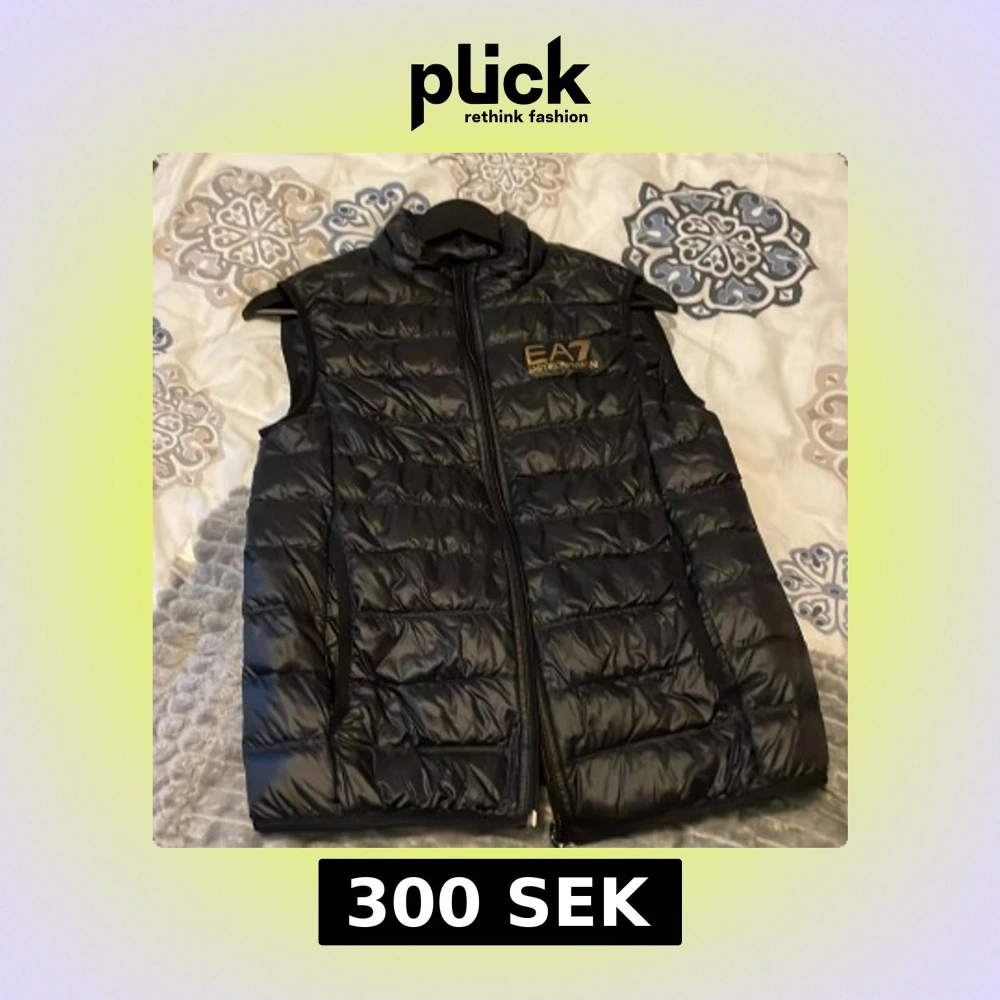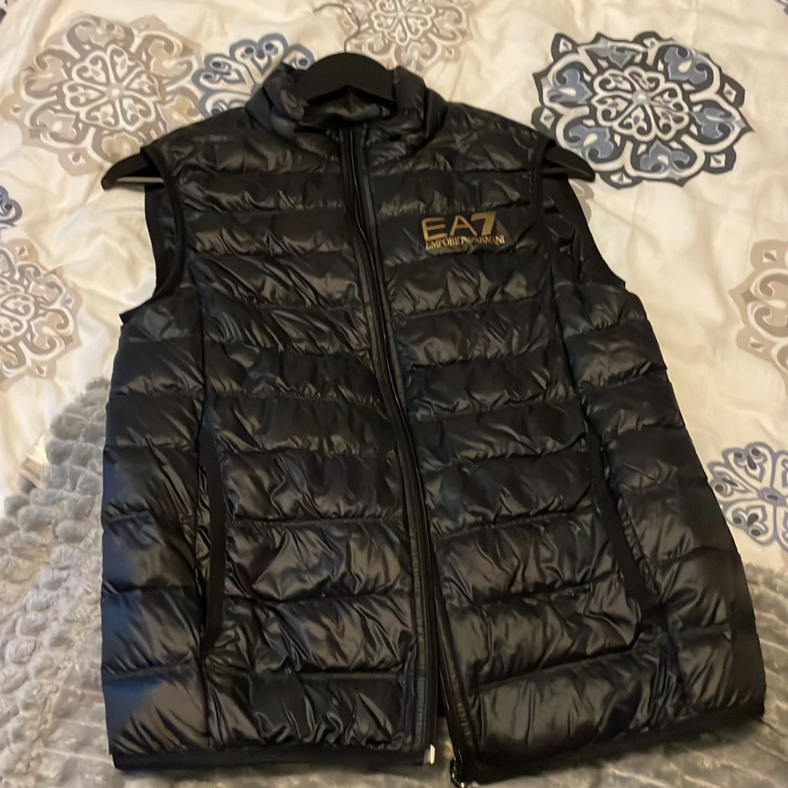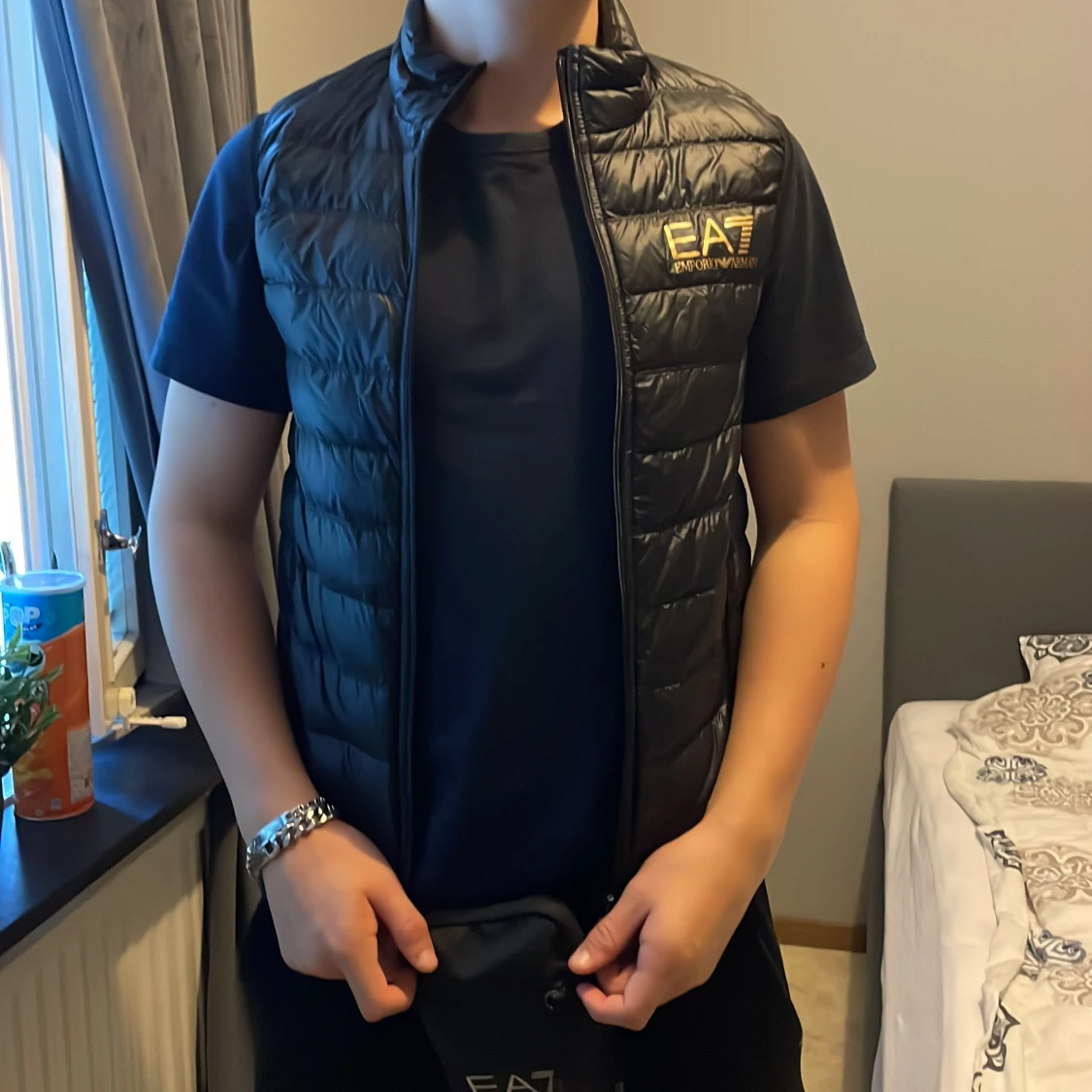 Svart quiltad dunväst från EA7 Emporio Armani med guldfärgad logga på bröstet. Västen har hög krage, dragkedja framtill och två sidofickor. Snygg och sportig look som passar perfekt till lager-på-lager-stil.