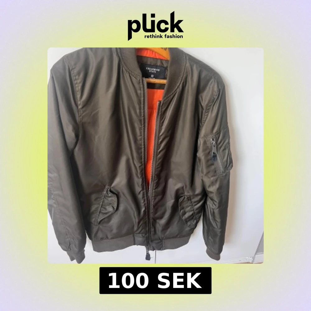 Snygg olivgrön bomberjacka från Cedarwood State i storlek XS. Jackan har orange foder, klassisk ribbad krage och muddar, samt dragkedja framtill och på ärmen. Tillverkad i syntetmaterial och har två fickor framtill.