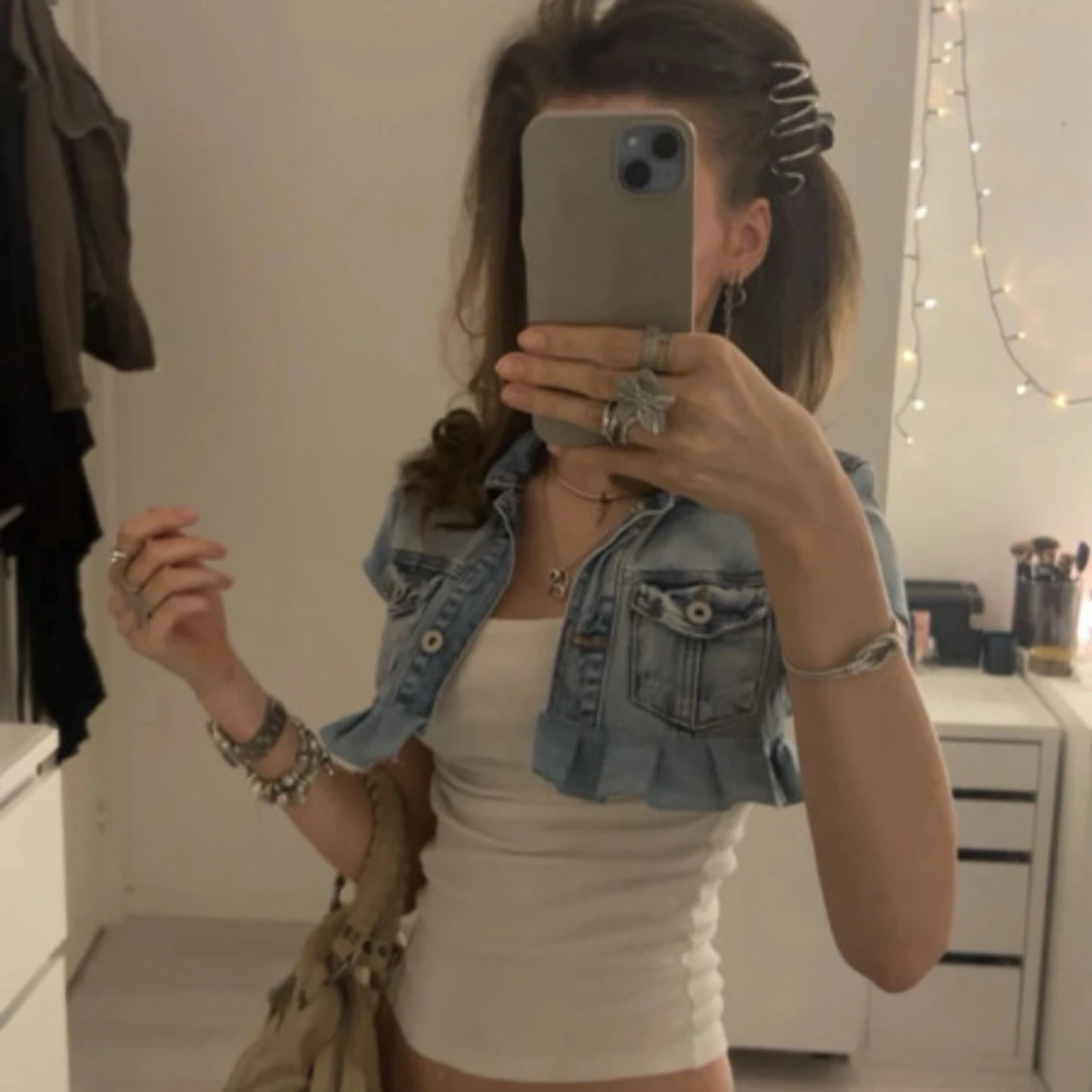 Säljer en croppad ljusblå jeansväst med volangkant nertill. Jättefin till outfits! I xs/s💞