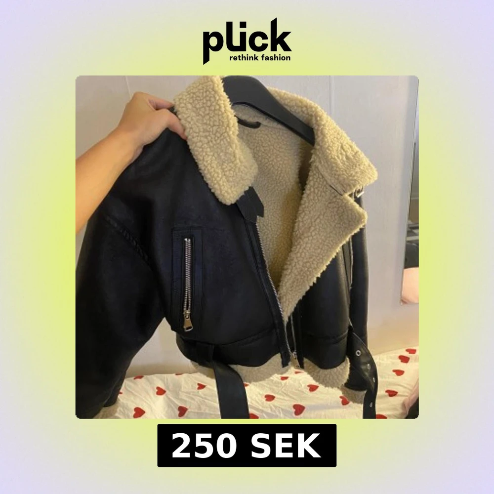 Snygg svart bikerjacka med beige fuskpälsfoder och krage. Jackan har dragkedjor, bälte i midjan och detaljer i silver. Perfekt för dig som vill ha en cool och varm look under höst och vinter. Helt ny använd en gång jätte bra skick