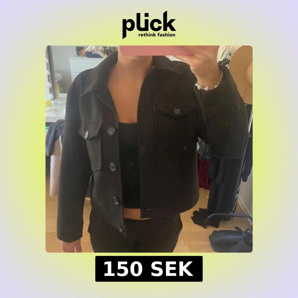 Snygg svart kappa med stora knappar framtill och på bröstfickorna. Jackan har en boxig, croppad passform och är tillverkad i ett tjockare material som känns mjukt och värmande. Perfekt att slänga över en hoodie eller t-shirt för en chill look. Den är lite nopprig, men inget man tänker på. Priset går att diskutera!🤗