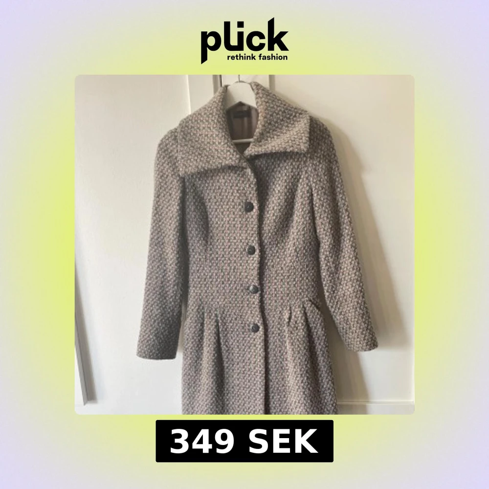 Söt kappa från Benetton med bred krage och markerad midja. Färgerna går i grått, rosa och beige. Kappan är välanvänd men ändå fin. Den har blivit för liten för mig och därför har den tyvärr spruckit lite i sömmarna i fodret. Se sista bilden. Är nog inte så svårt att fixa för den som orkar och inget som syns på utsidan.