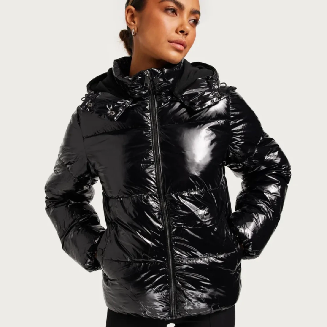 Säljer en svart pufferjacka med glansig finish och huva. Jackan har dragkedja framtill och två fickor på sidorna. Perfekt för kalla dagar när du vill hålla stilen och värmen. Passar dig som gillar en modern och sportig look. Skriv för fler bilder💕