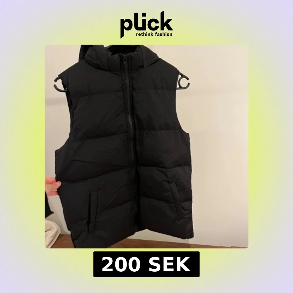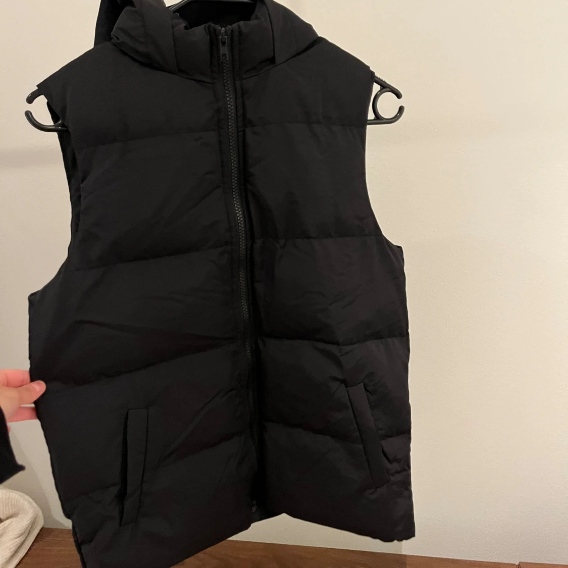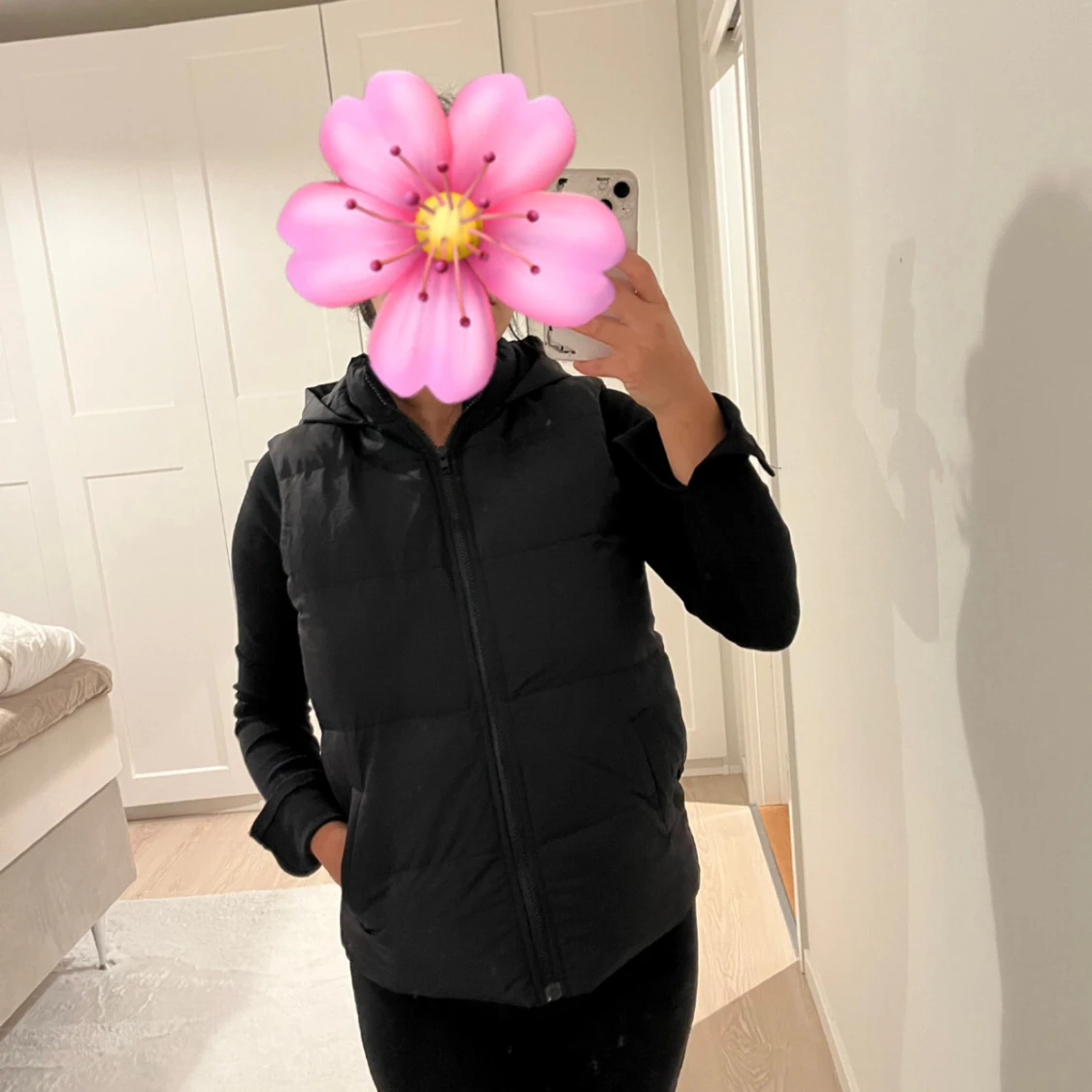 Snygg svart dunväst med huva och dragkedja framtill. Västen har två fickor på sidorna och en quiltad look som ger en sportig vibe. Perfekt att slänga över en hoodie för extra värme under kyliga dagar.