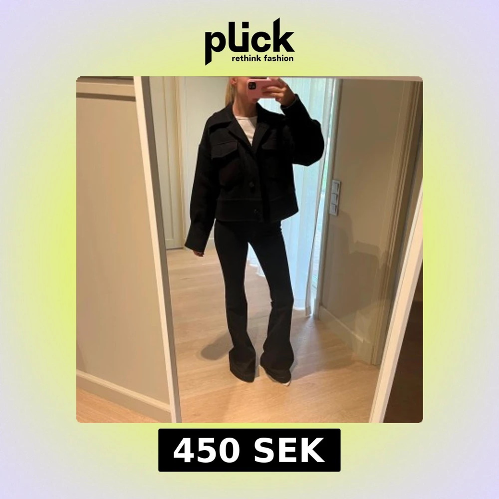 Säljer en svart jacka från Meotine med stora bröstfickor och knappar framtill. Jackan har en boxig, oversized passform och långa ärmar. Perfekt att slänga över en t-shirt för en cool och avslappnad look. En knapp är borta på en fickan men inget man tänker på