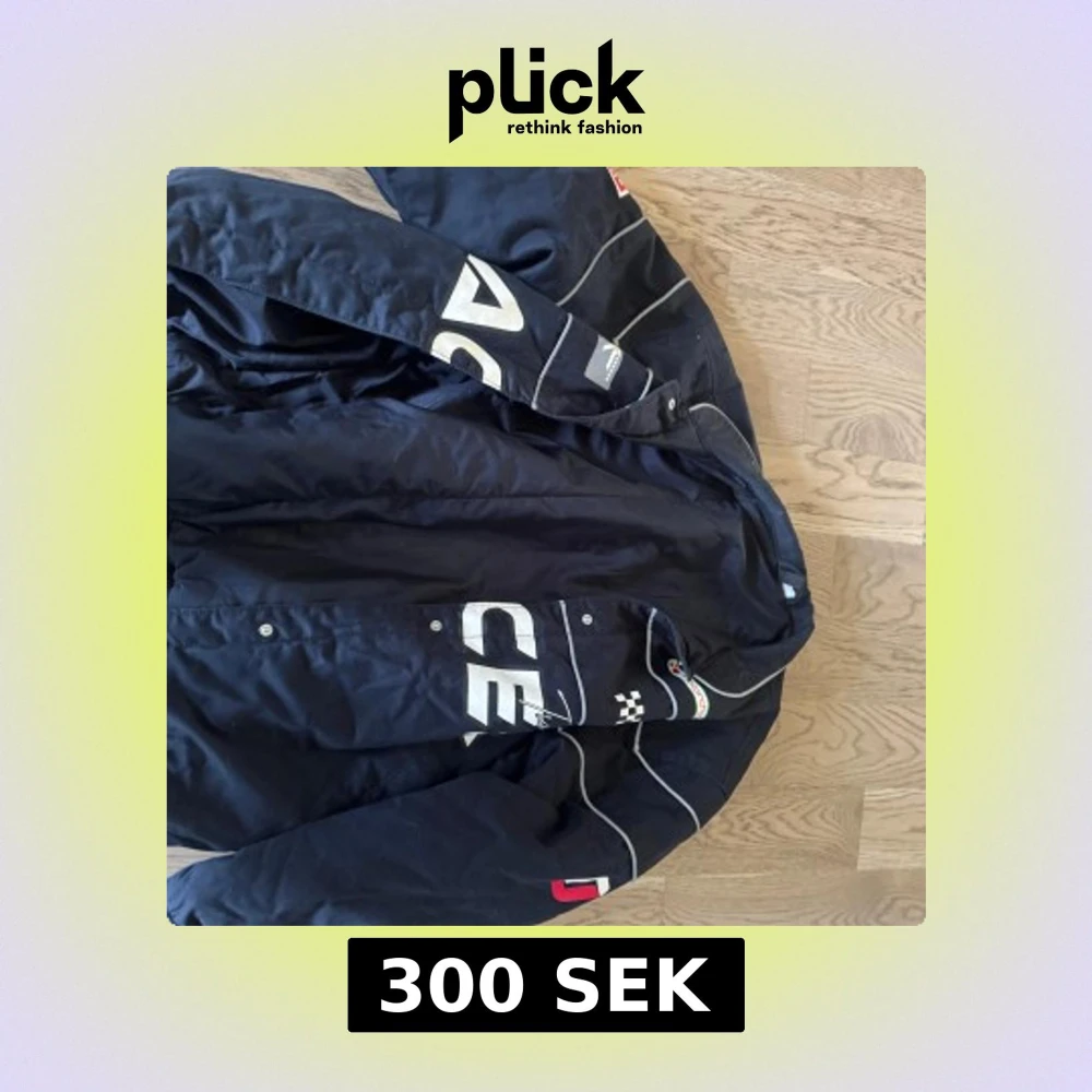 Cool svart vindjacka från Divided i storlek XS. Jackan har vita tryck och detaljer, racinginspirerade mönster och reflexliknande piping längs ärmar och axlar. Stängs med tryckknappar och har sportig vibe, perfekt för dig som gillar streetstyle.
