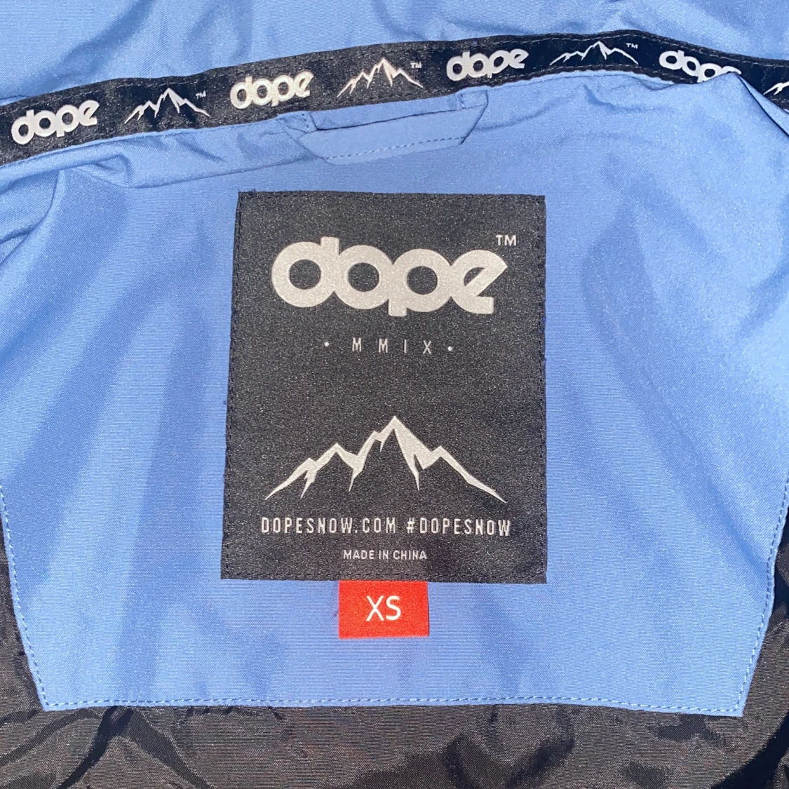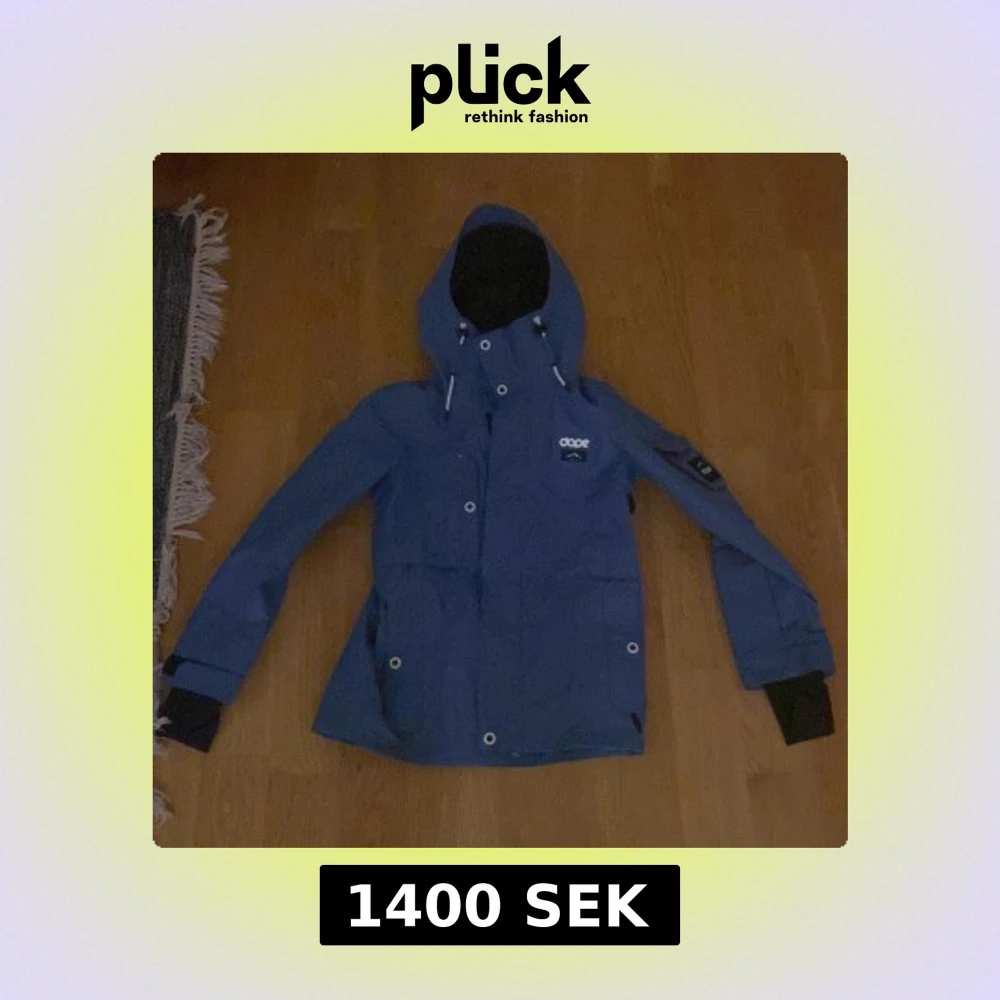 Säljer en blå skidjacka från Dope i storlek XS. Jackan har huva med snörning, vita detaljer på dragkedjor och knappar. Märket syns tydligt på bröstet och insidan. Perfekt för dig som gillar skidor och outdoor. Endast använd två veckor.