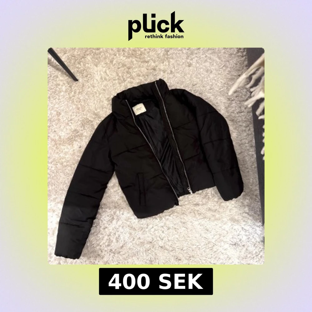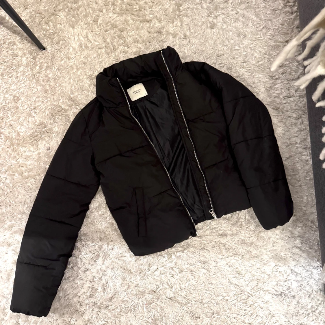 Säljer en svart pufferjacka med hög krage och dragkedja framtill. Jackan är vadderad och har en clean, stilren look som passar perfekt till kalla dagar.
