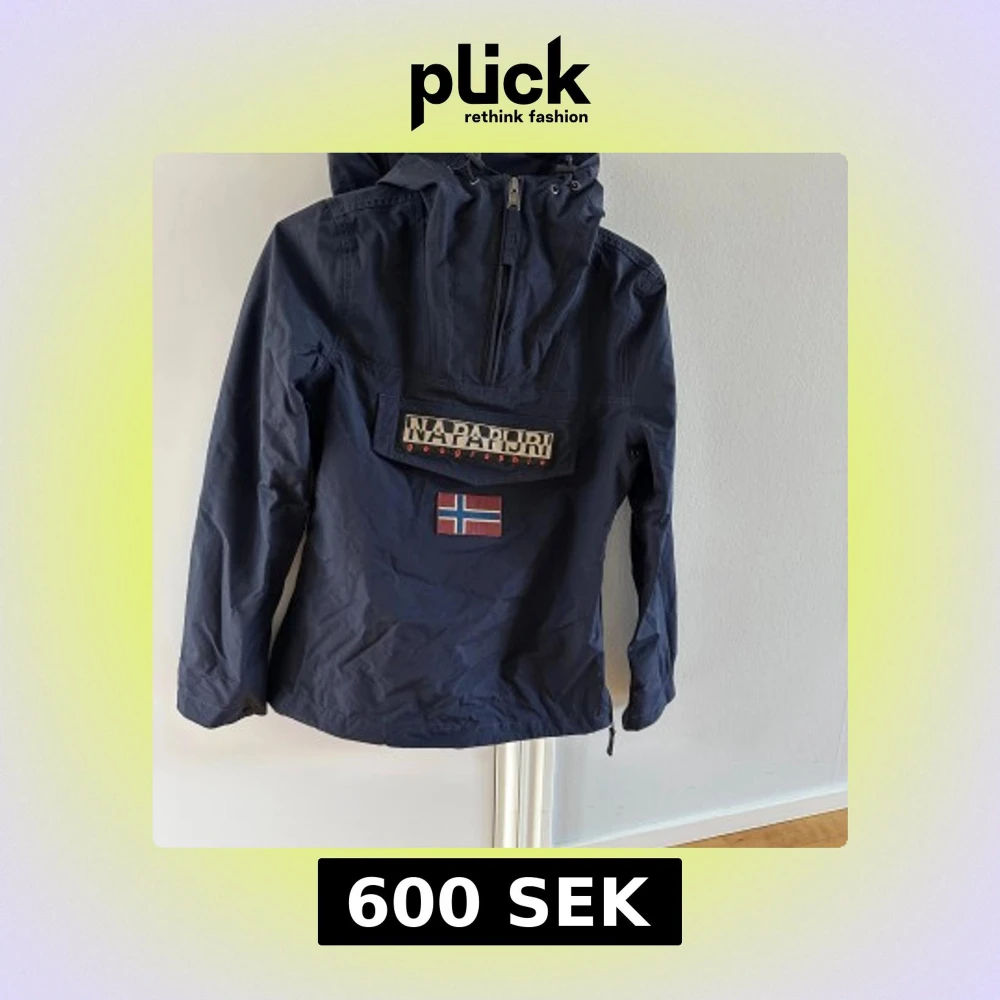 Säljer en mörkblå skaljacka från Napapijri med huva och dragkedja. Jackan har en stor ficka framtill med logotyp och norsk flagga. Perfekt för utomhusaktiviteter med stil. 🧥