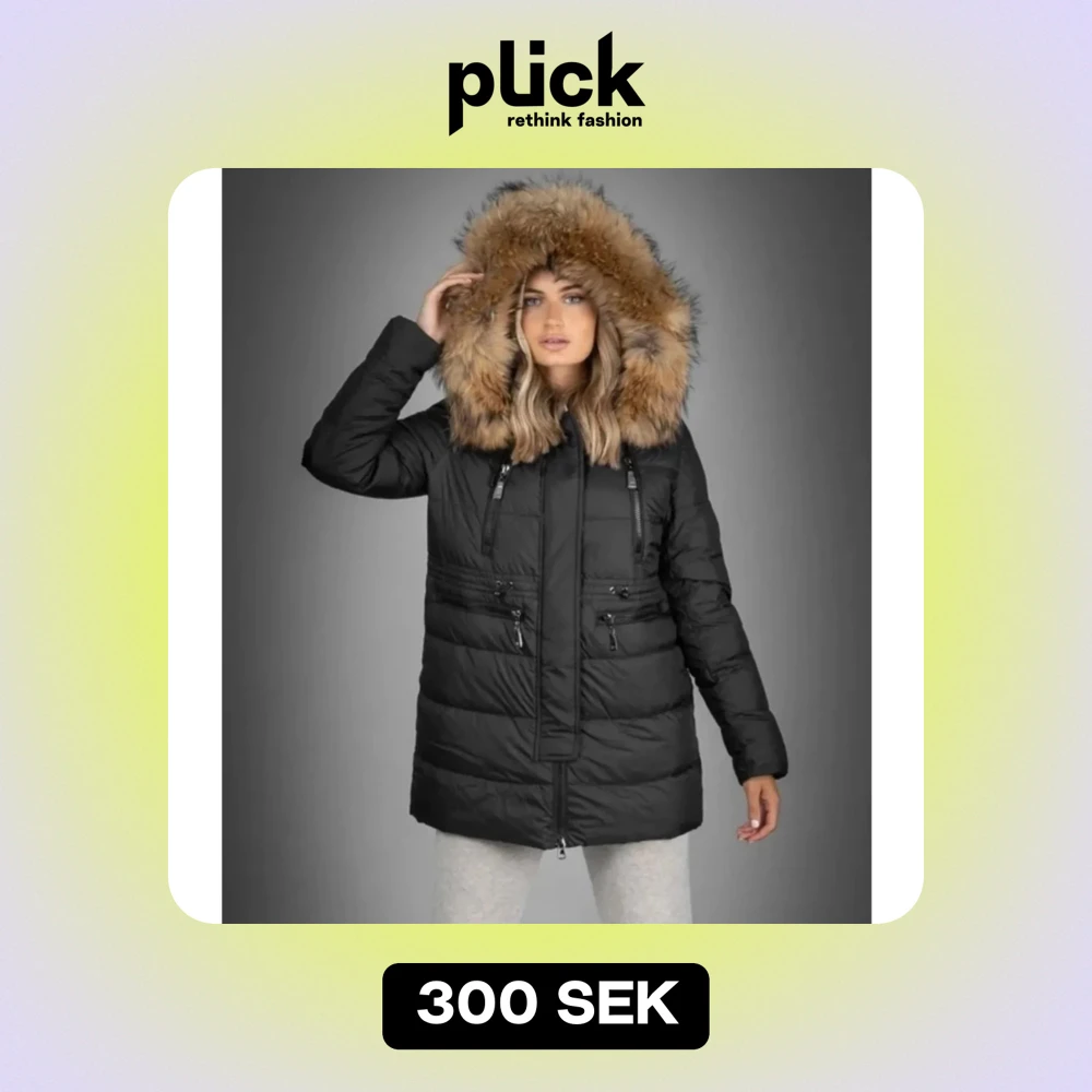 Säljer en snygg svart dunjacka med mysig pälsdetalj på huvan. Jackan har dragkedja och knappar framtill, perfekt för kalla vinterdagar. Den är i bra skick och håller dig varm och stilren. Passar perfekt för både vardag och festliga tillfällen.