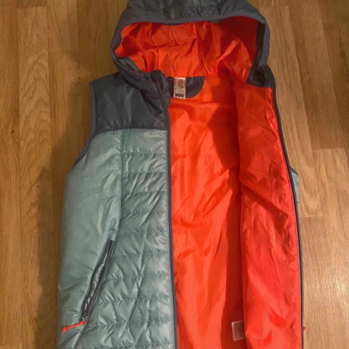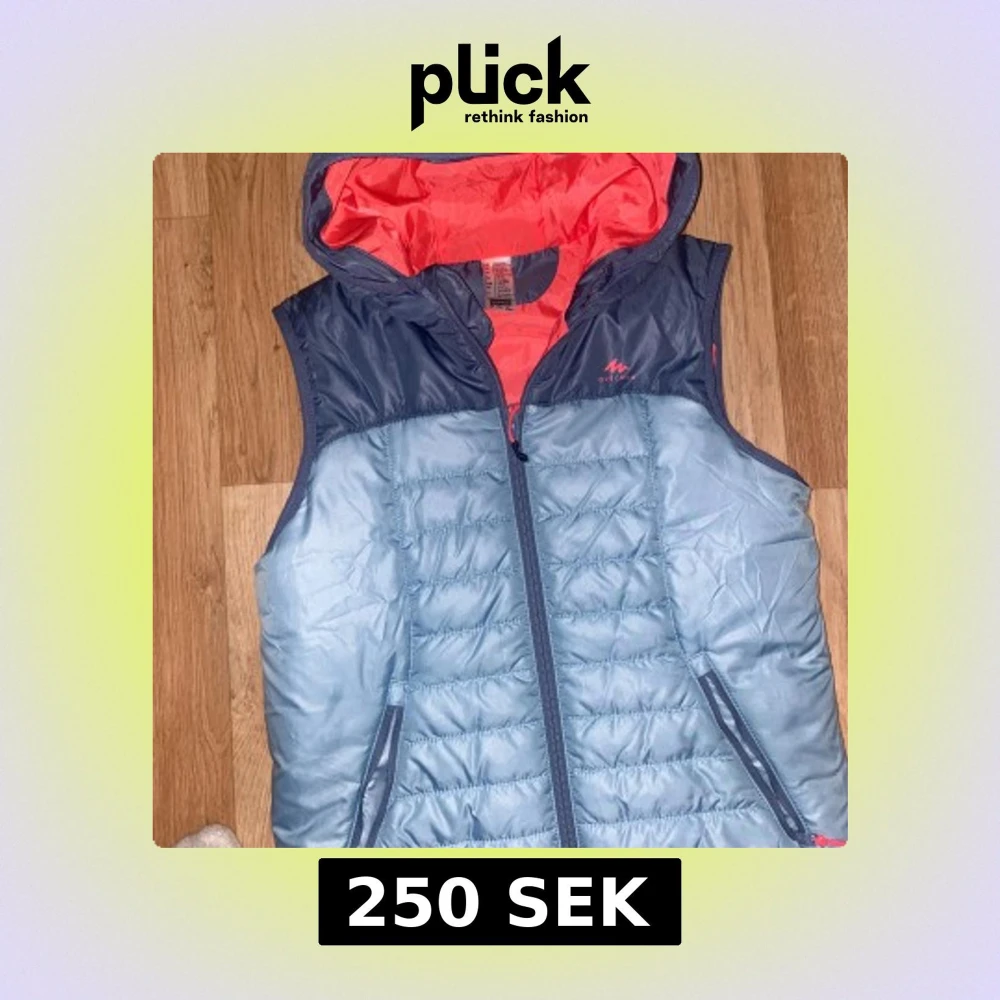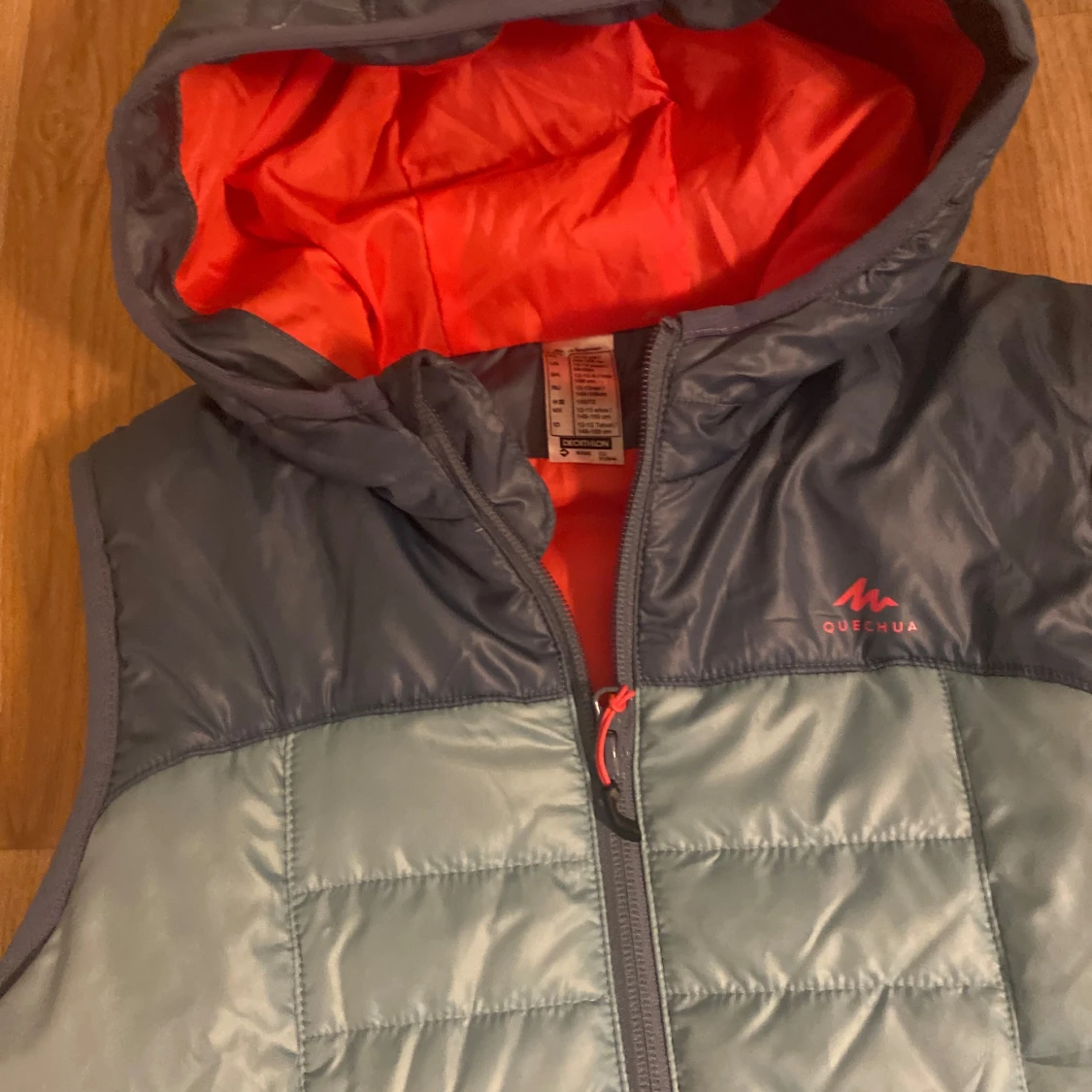 Snygg blå dunväst från Quechua med kontrastfärgad orange insida och huva. Västen har dragkedja framtill, två fickor med dragkedja och quiltad design. Perfekt för lager-på-lager och outdoor-aktiviteter. Materialet är lätt och syntetiskt.