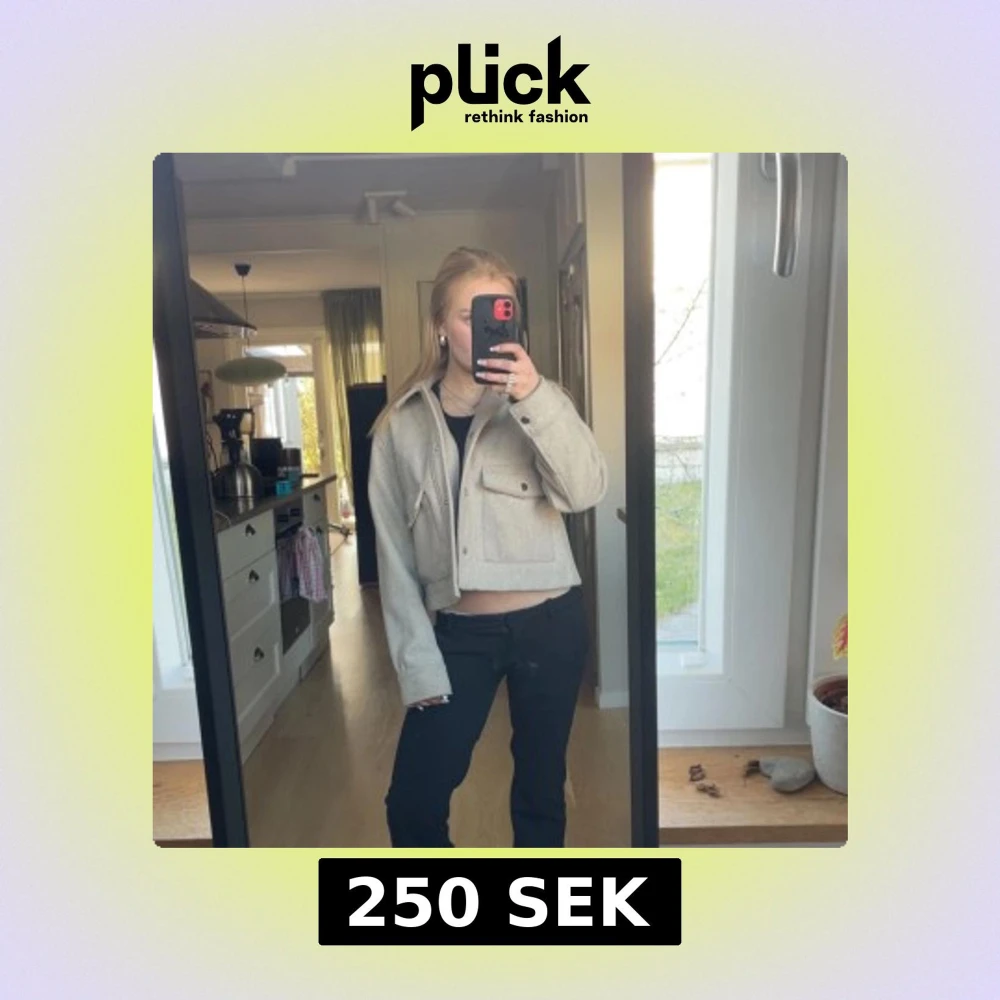 Säljer en beige croppad jacka med stora fickor framtill och knappar. Jackan har lång ärm och en stilren, enkel design som passar perfekt till vardags. Materialet känns mjukt och jackan har en modern passform.