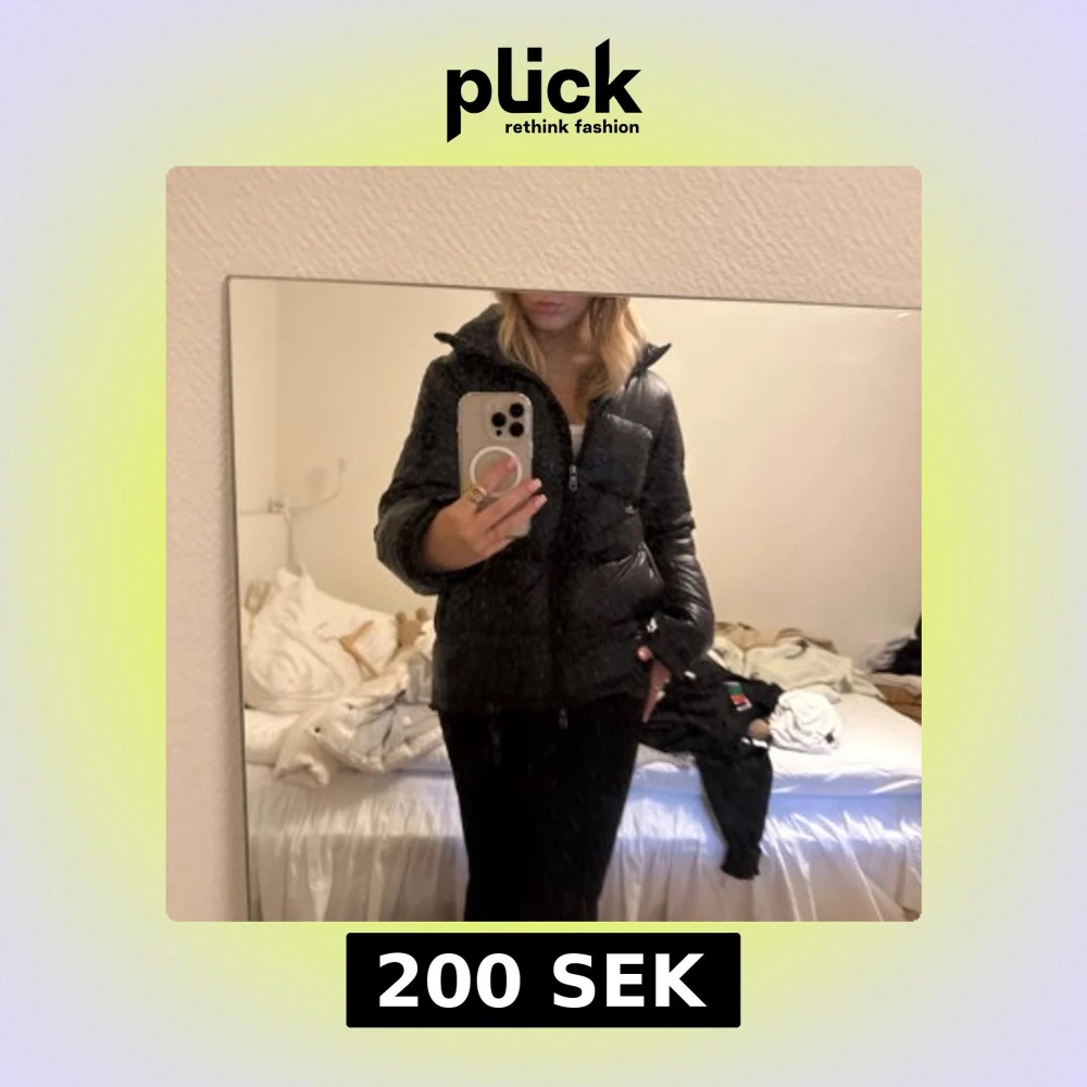 Säljer en svart pufferjacka med hög krage och dragkedja framtill. Jackan har en klassisk quiltad look och är perfekt för kyliga dagar. Den är långärmad och har en snygg, lite oversized passform. Grym att slänga på sig när det är kallt ute! Ny pris på jackan är runt 2000kr