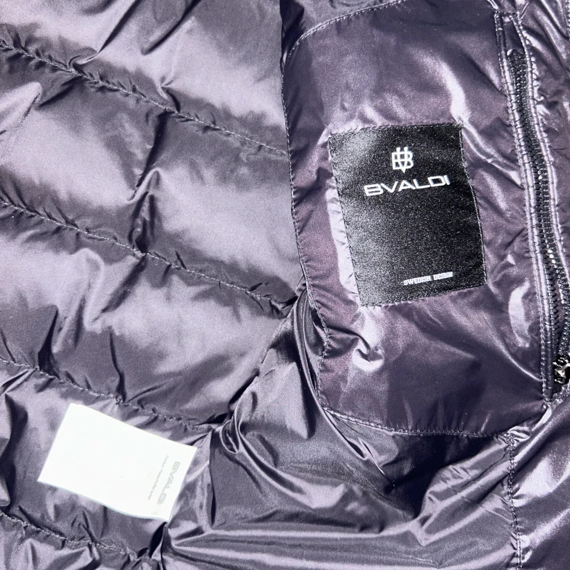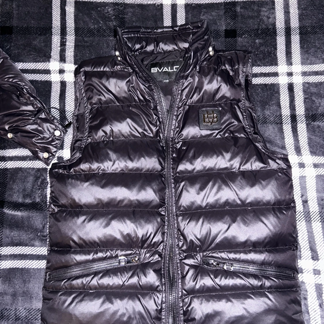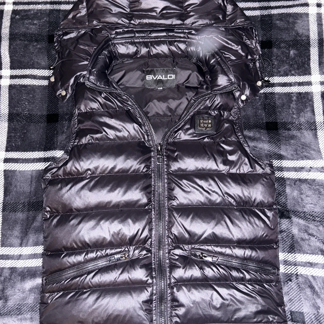 Snygg svart dunväst från Bvaldi med glansig finish och hög krage. Västen har två dragkedjefickor framtill, avtagbar huva med tryckknappar och ett stilrent Bvaldi-märke på bröstet. Perfekt för lager-på-lager under kyliga dagar.