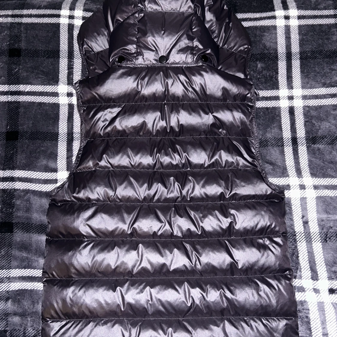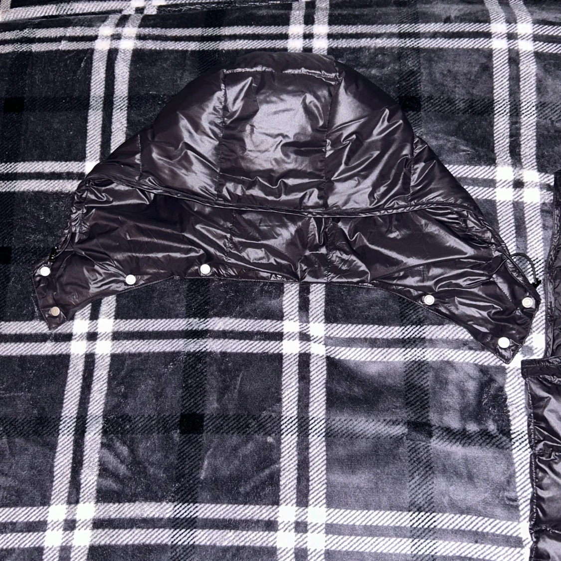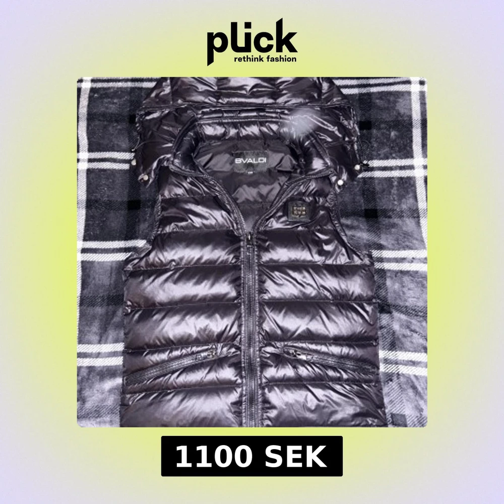 Snygg svart dunväst från Bvaldi med glansig finish och hög krage. Västen har två dragkedjefickor framtill, avtagbar huva med tryckknappar och ett stilrent Bvaldi-märke på bröstet. Perfekt för lager-på-lager under kyliga dagar.