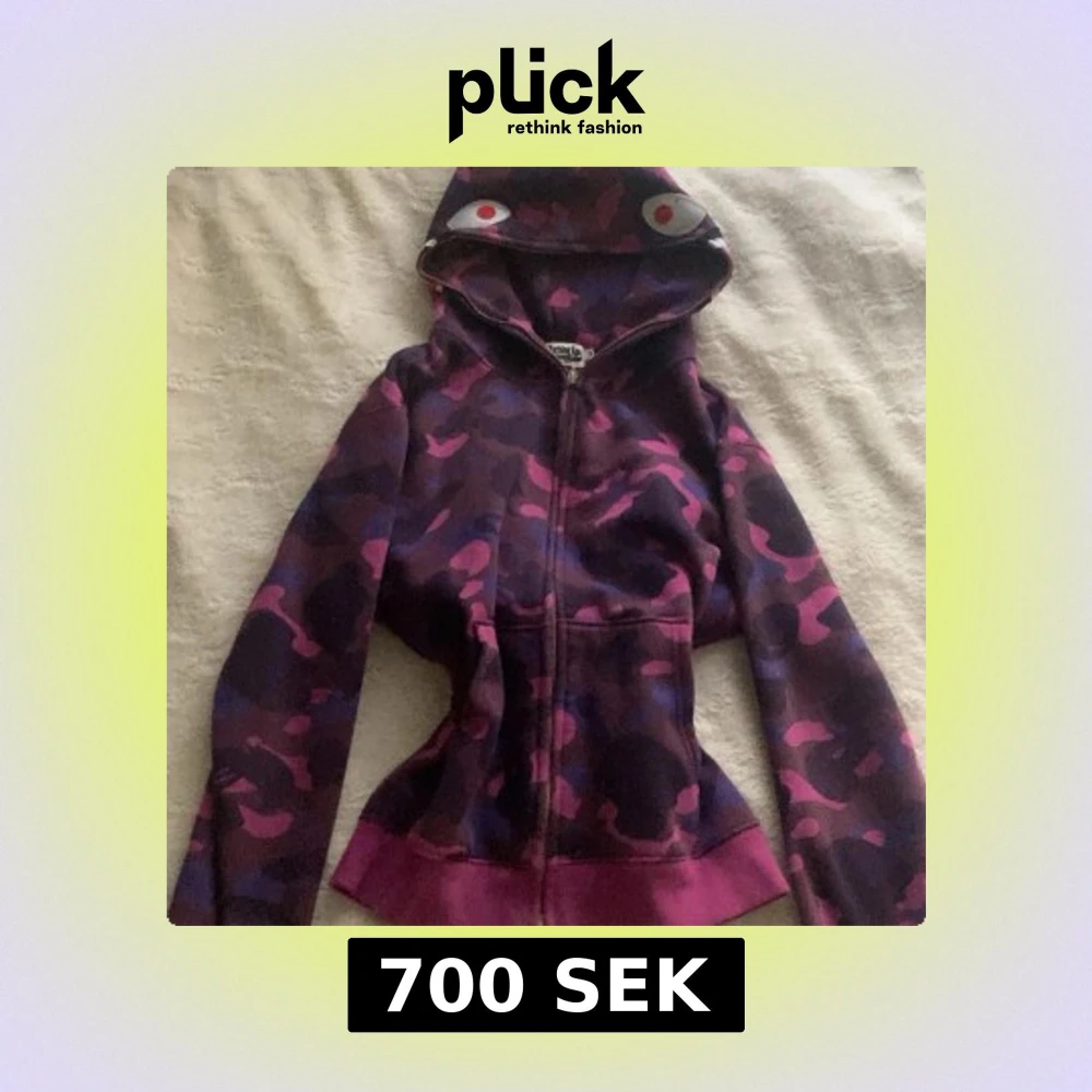 Säljer en lila och rosa camo zip hoodie från BAPE med hajmotiv och broderade bokstäver på huvan. Jackan har dragkedja hela vägen, dock är dragkedjan lite krånglig ibland upp och fickor framtill. Knappt använd bara legat i garderoben ett tag. Bra skick💕strl m fast passar mig som har xs/s lite baggy.