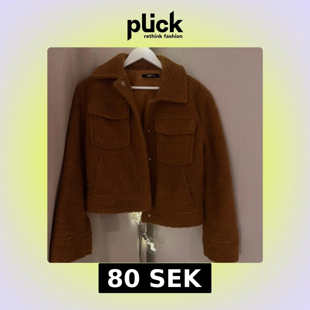 Mysig brun teddyjacka från Gina tricot med två stora bröstfickor och knappar framtill. Jackan har en kort passform och långa ärma. Den är gjord i ett mjukt och fluffigt material som håller dig varm.