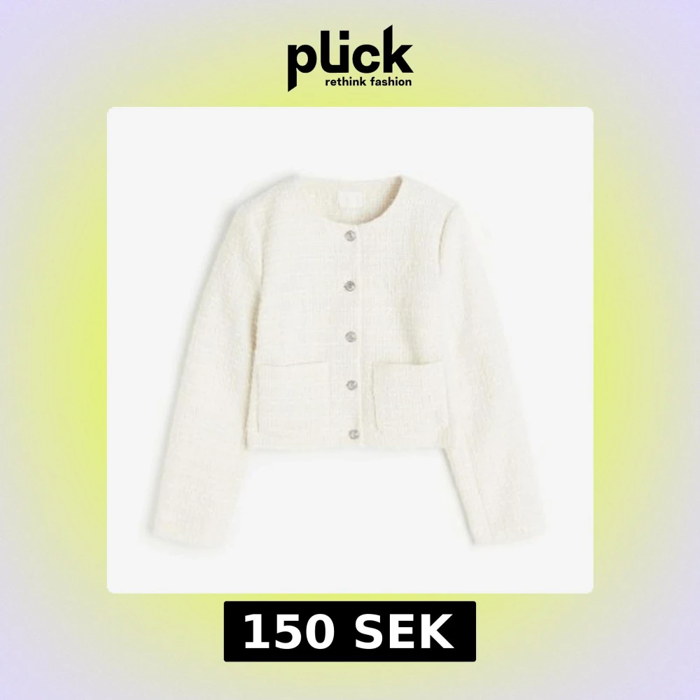 Elegant vit kavaj med en stilren design och knappar framtill. Den har en klassisk rund hals och två fickor. Perfekt för en chic look. Köpt för 500kr