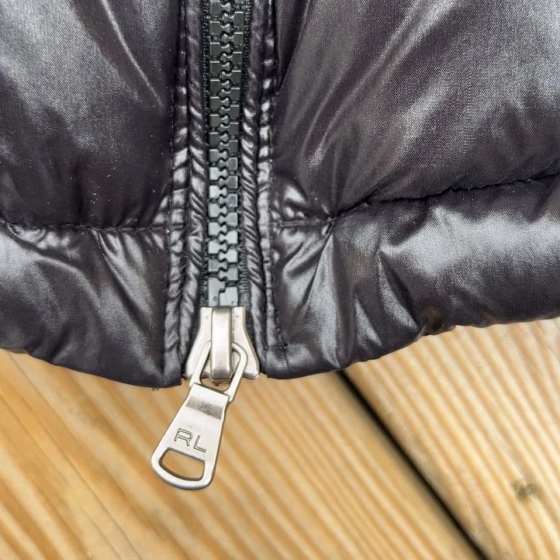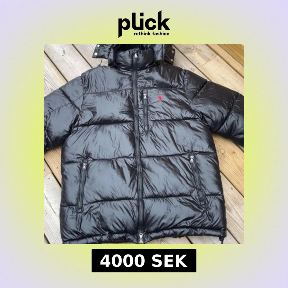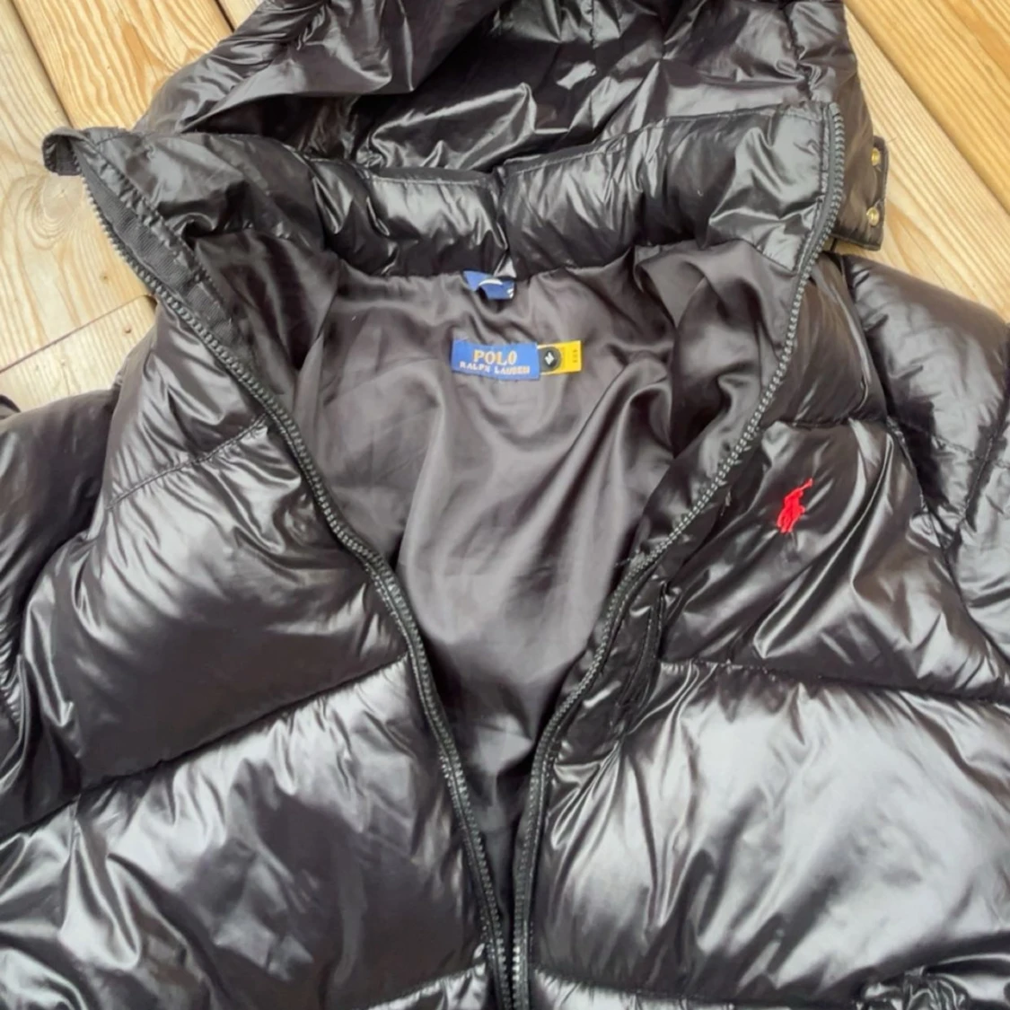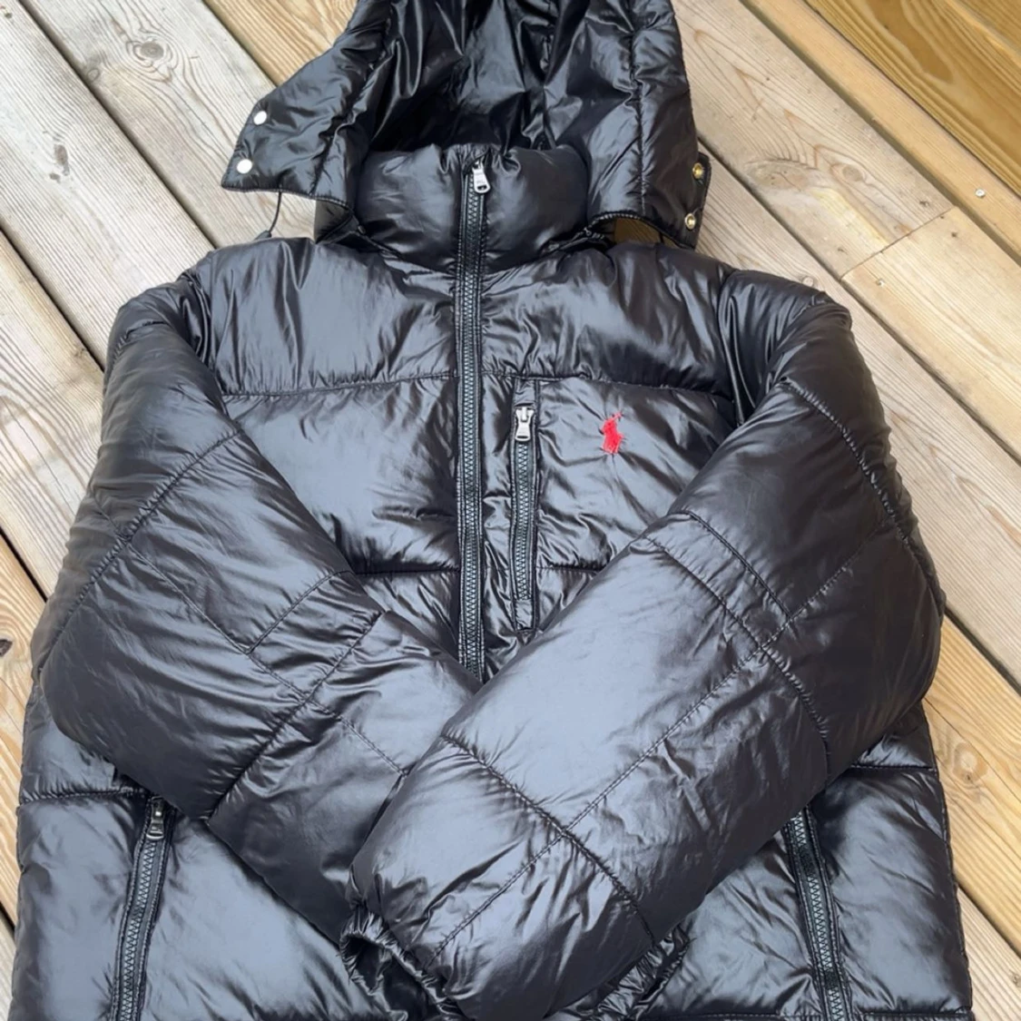 Svart pufferjacka från Polo Ralph Lauren med glansig finish, röd broderad logga på bröstet och tre dragkedjeförsedda fickor. Jackan har huva, hög krage och långa ärmar. Perfekt för kalla dagar och riktigt snygg streetstil. Storlek M för fler bilder eller frågor. Tveka inte att skriva.