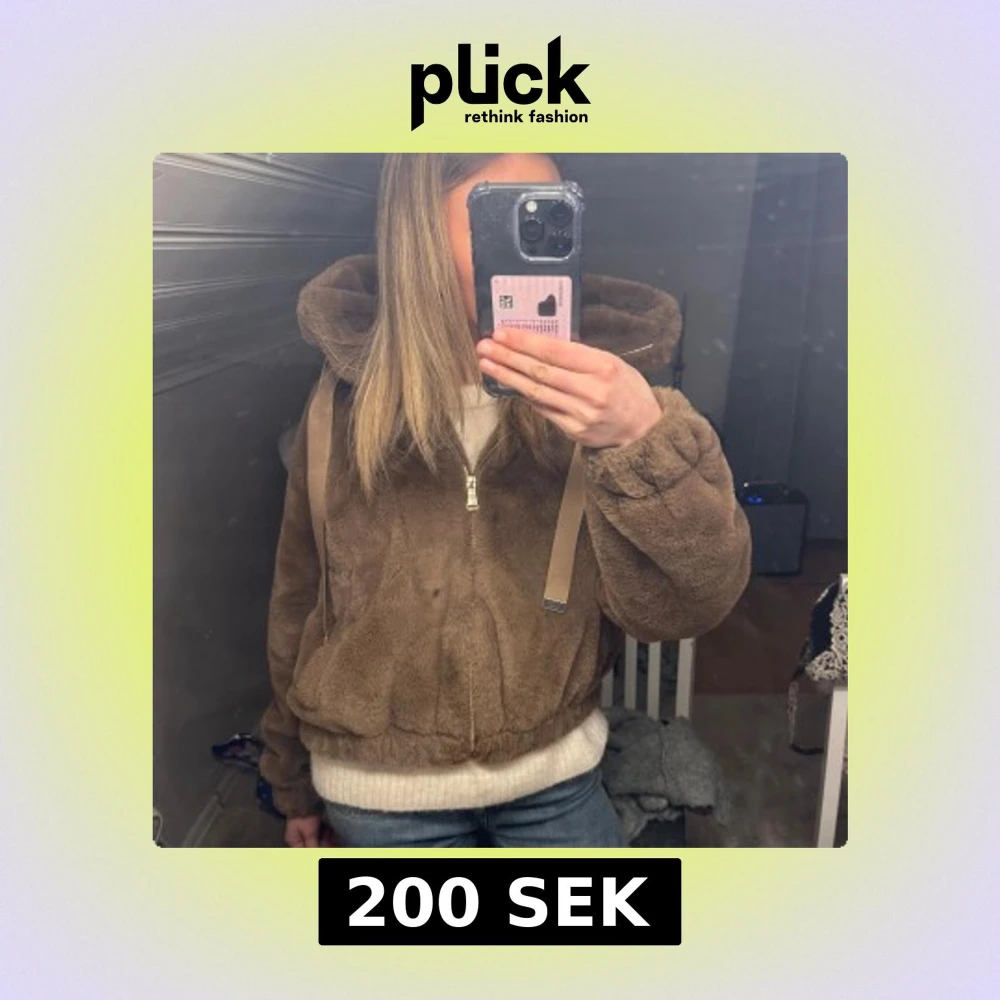 Mysig brun teddyjacka med huva och dragkedja framtill. Perfekt för kyliga dagar med sin fluffiga och varma design. Jackan har lÄnga Àrmar och en avslappnad passform.
