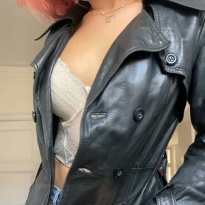 ÄKTA retro läderkappa!! Köpt secondhand men har tyvärr blivit för liten för mig 🥺 Användt skick då en knapp saknas och ett hål i en av fickorna - därav priset. Superfin klassisk läderkappa som går att styla båda vår, höst å sommar. Okänd storlek men skulle säga att den är en XS eller S. Skriv vid fler frågor eller bilder!❤️❤️❤️