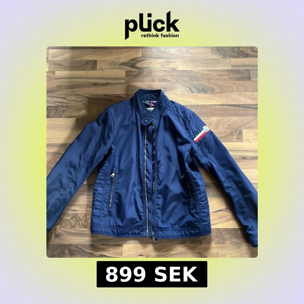 Schysst marinblå vindjacka från Moncler med klassisk ståkrage och dragkedja framtill. Jackan har Moncler-logga och rödvitblå detalj på ärmen, samt två fickor med dragkedja. Glansig insida vilket ger en klassisk look. Ny pris på denna är oklart.
