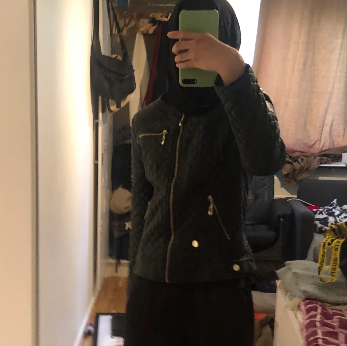 Det här är en skinnjacka i stl m men skulle säga att den är S , jag älskar den men den har blivit lite för tajt , märket på jackan är yu and me, paris
