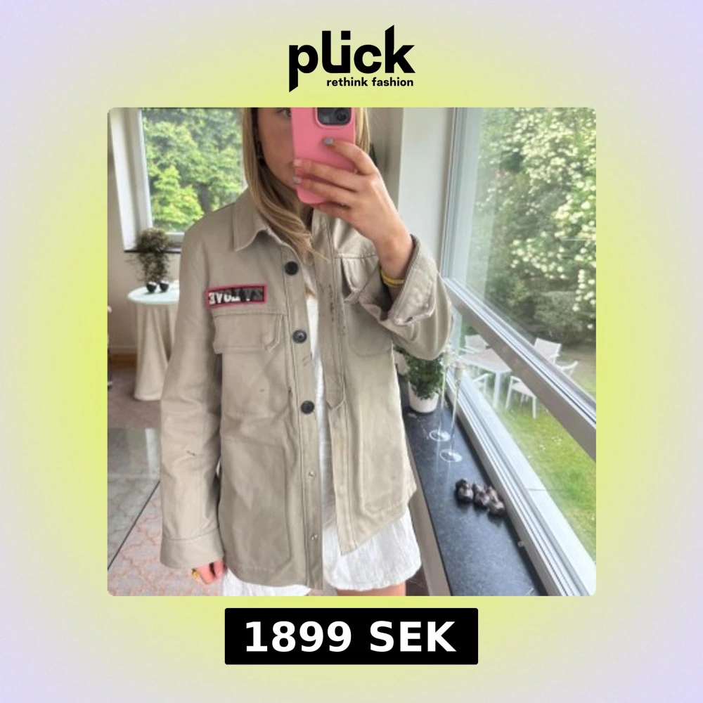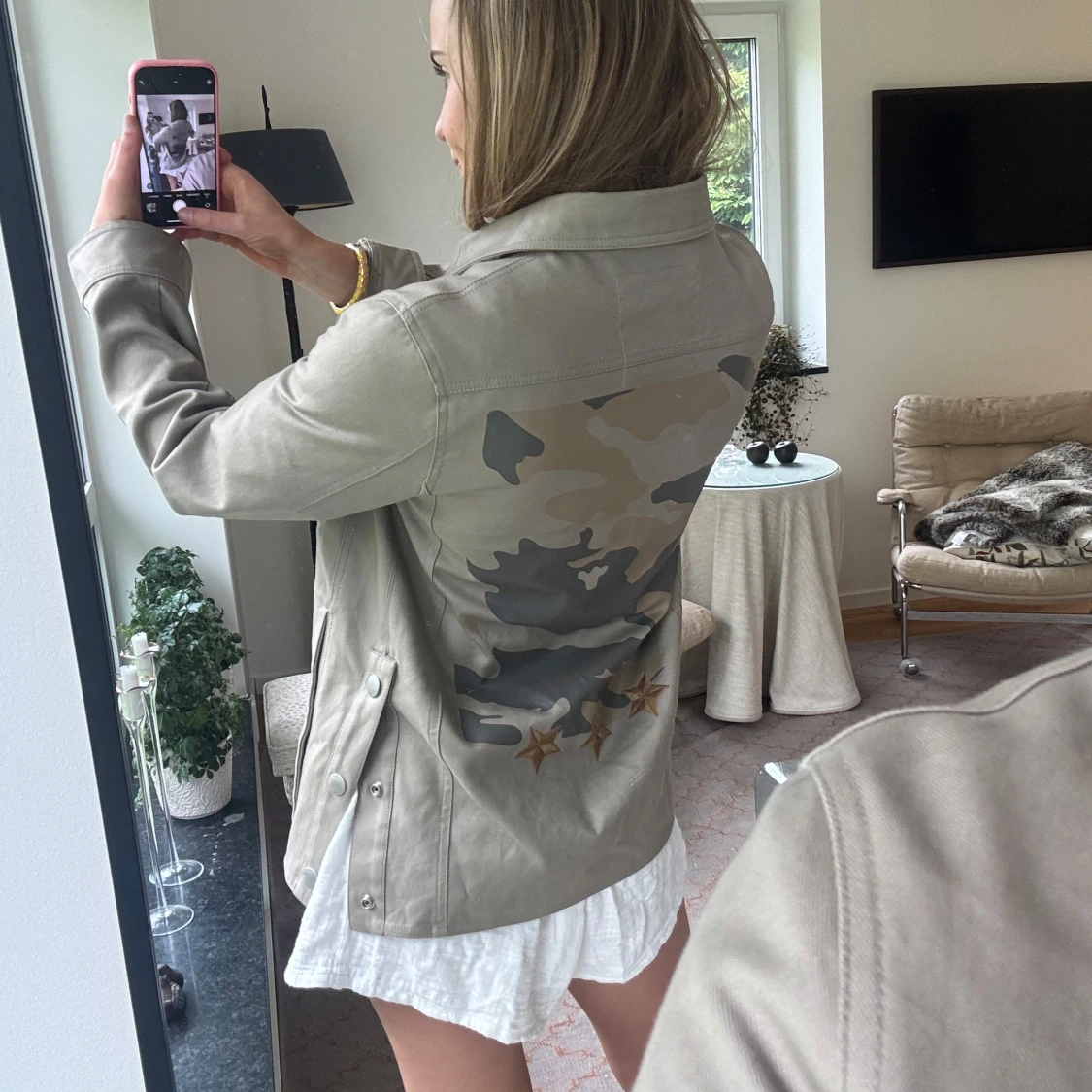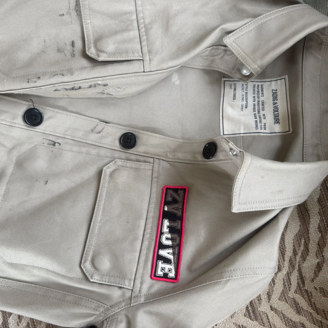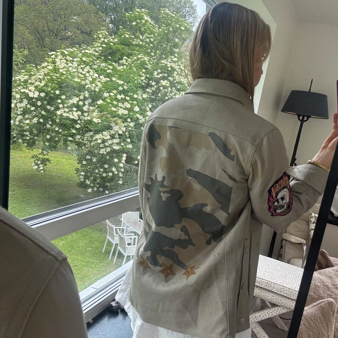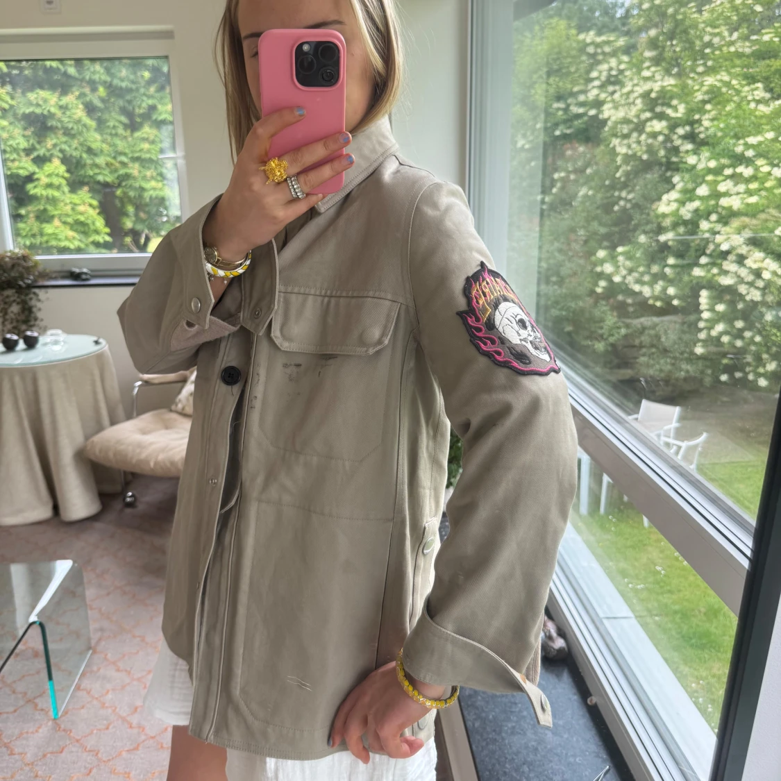 Beige overshirt från Zadig & Voltaire med coola patches och tryck. Framsidan har en ZV LOVE-patch och ärmen har en döskalle med flames. Baksidan har camomönster och guldstjärnor. Jackan har knappar framtill och stora fickor. Perfekt för en edgy streetstil.