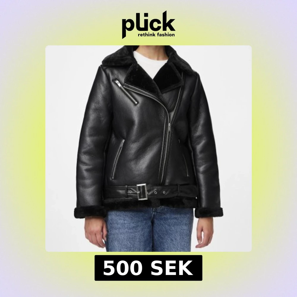 Svart pälsjacka med bälte och dragkedjor