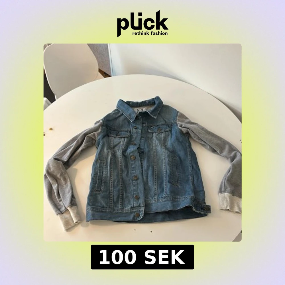 Snygg jeansjacka från Zalando med gråa, mjuka ärmar i sweatshirtmaterial. Jackan har knappar framtill och två bröstfickor med lock. Perfekt för en avslappnad stil.
