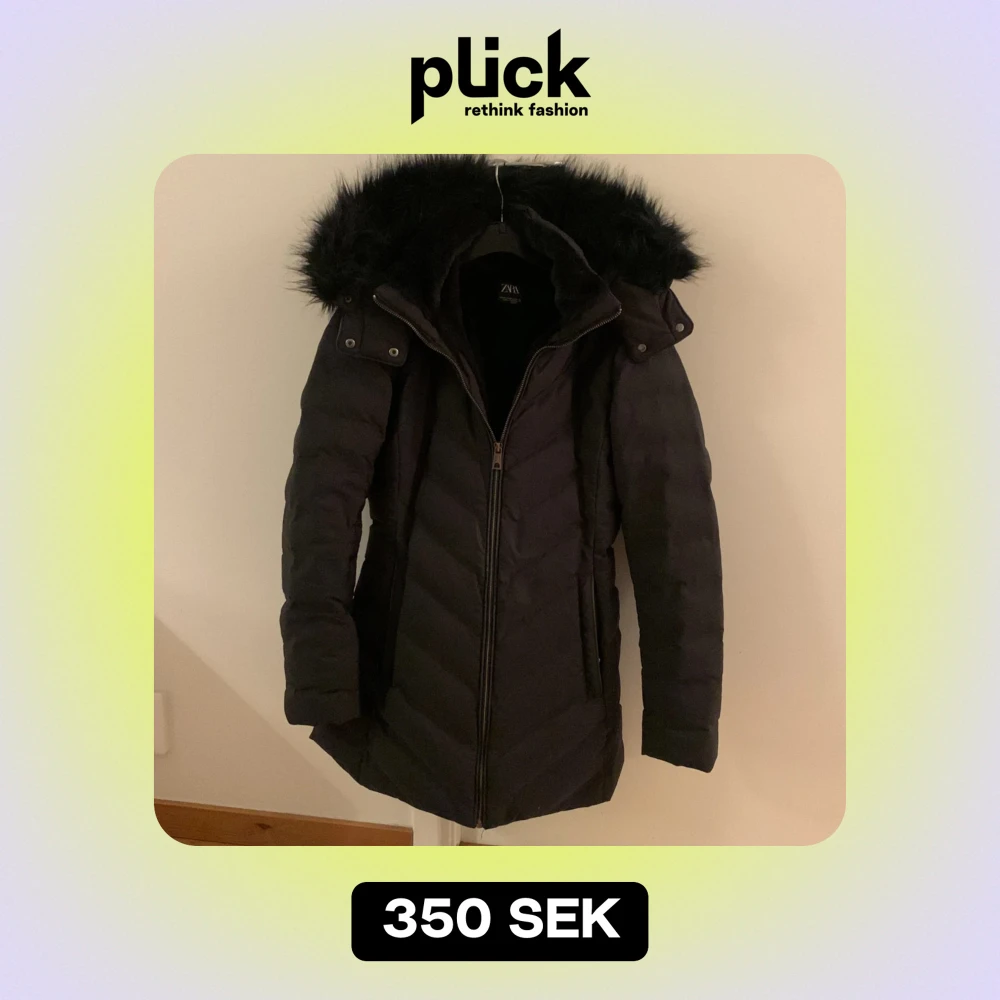 Säljer en snygg svart dunjacka från Zara med en fluffig pälshuva. Jackan har en dragkedja framtill och långa ärmar. Perfekt för kalla vinterdagar! 🖤