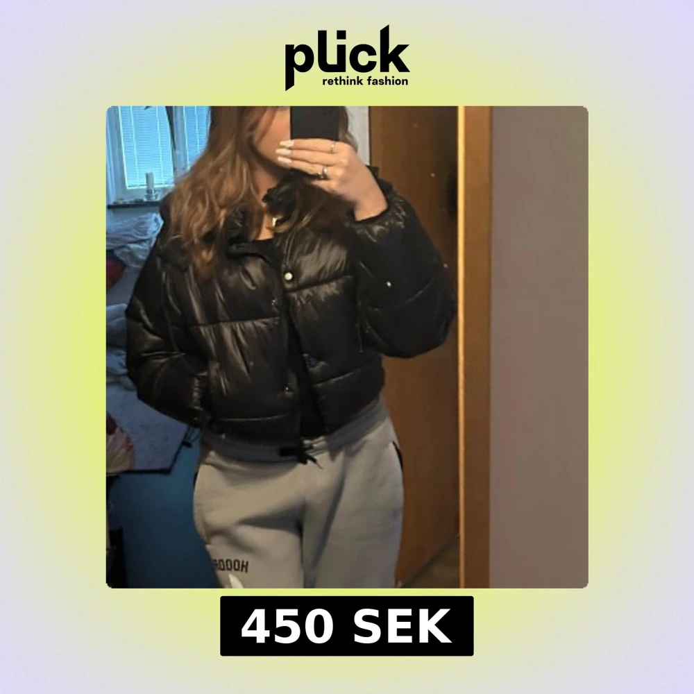 Säljer en svart, glansig pufferjacka från Zara. Jackan är croppad och har dragkedja samt knappar framtill. Den är vadderad och har långa ärmar, perfekt för kyligare dagar. Snygg och trendig modell som passar till många outfits.