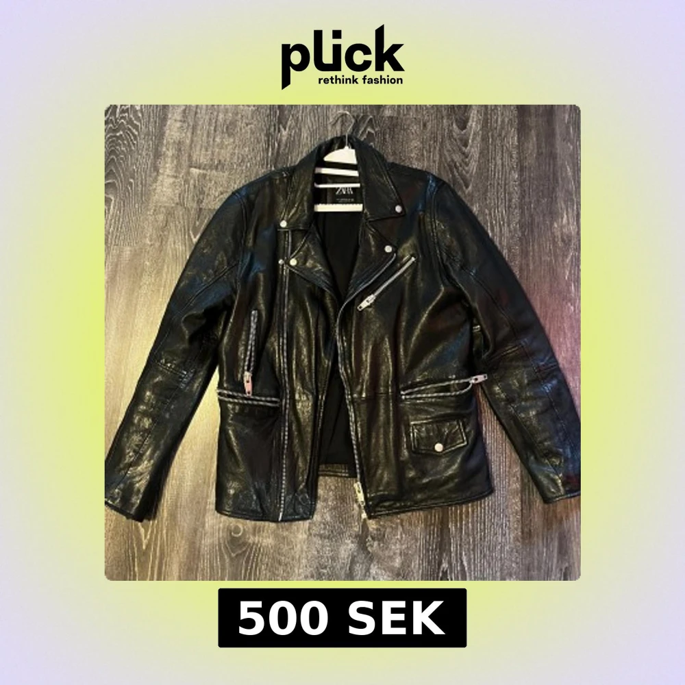 Snygg svart skinnjacka från Zara med klassisk bikerstil. Jackan har flera silvriga dragkedjor, snedställd front och coola detaljer som tryckknappar vid kragen. Perfekt för dig som vill ha en edgy look.