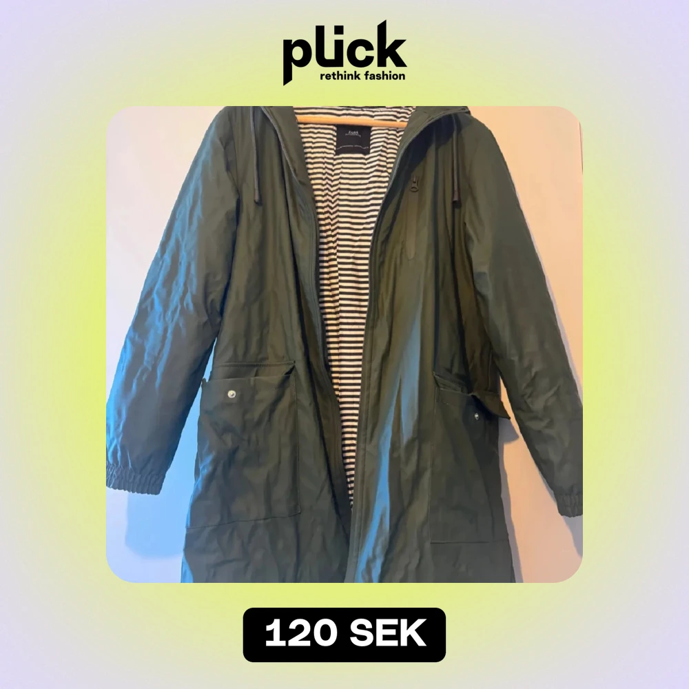 Snygg grön regnjacka med randigt foder. Jackan har långa ärmar och praktiska fickor framtill. Perfekt för regniga dagar och håller dig torr och stilren.
