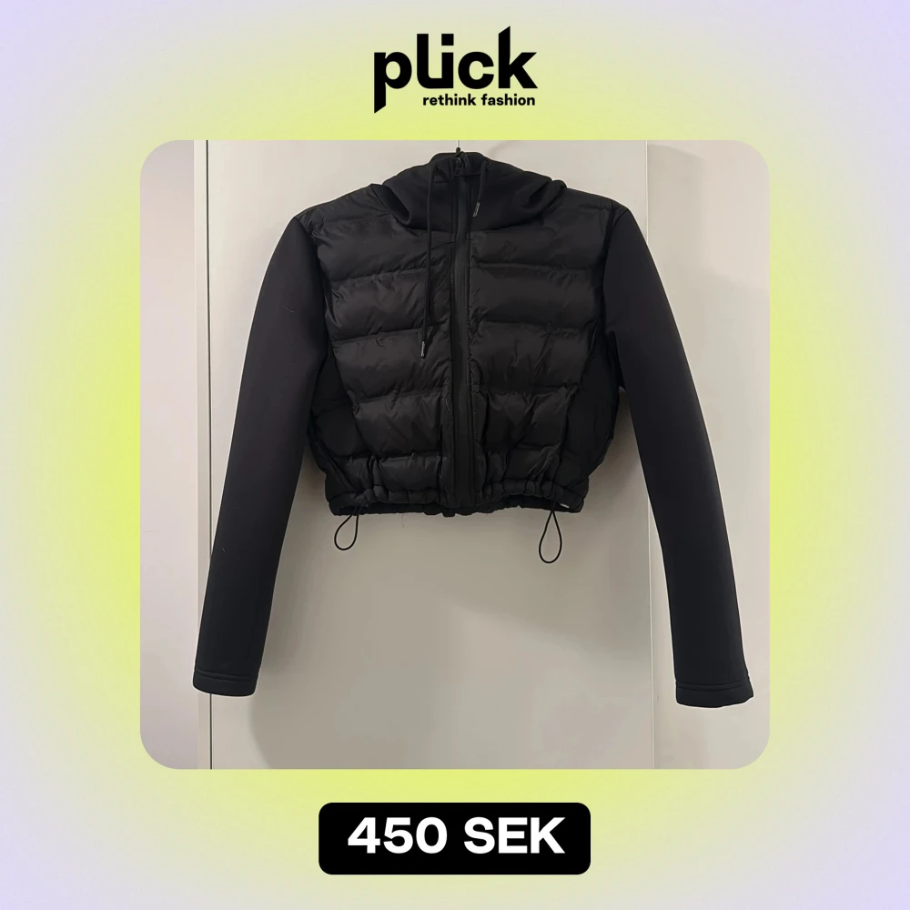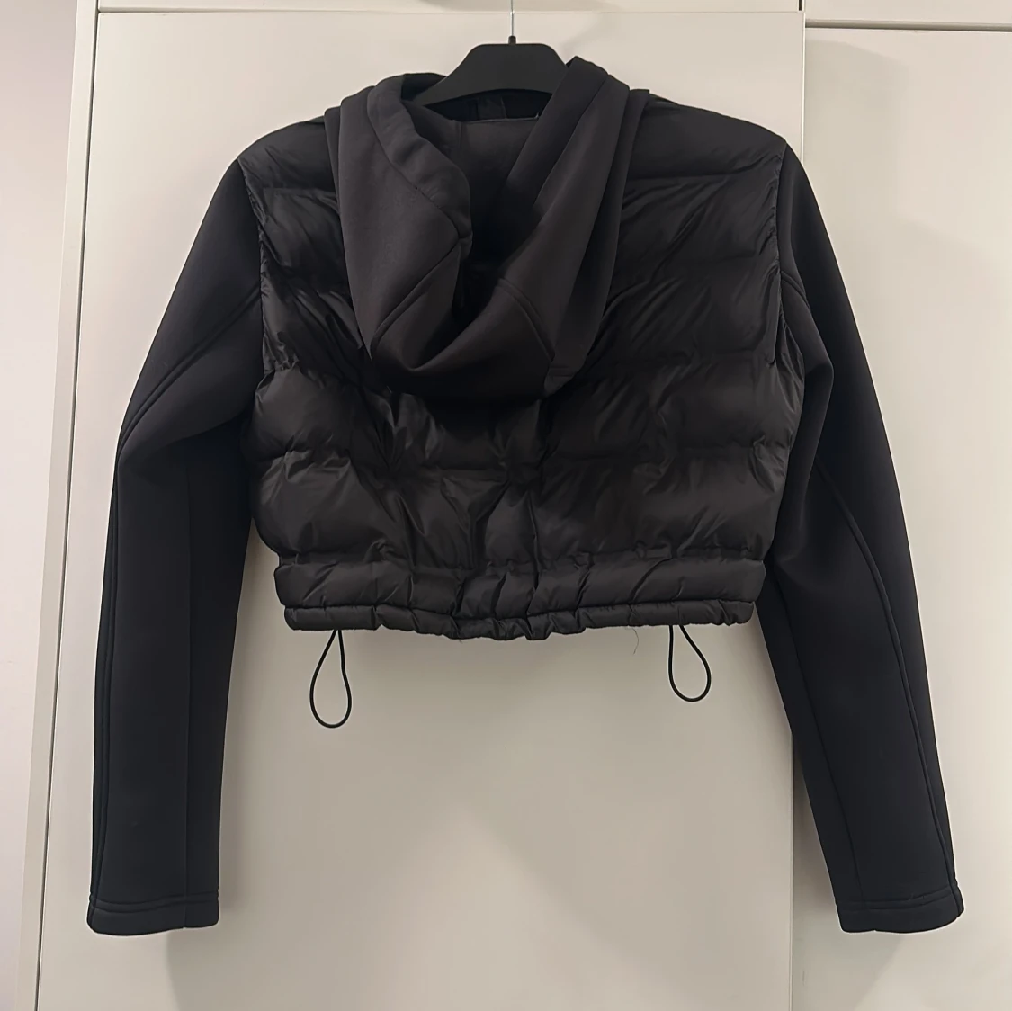 Snygg svart croppad pufferjacka med huva och dragkedja. Jackan har långa ärmar och justerbar dragsko i nederkant för en perfekt passform. Perfekt för kyliga dagar när du vill hålla stilen.
