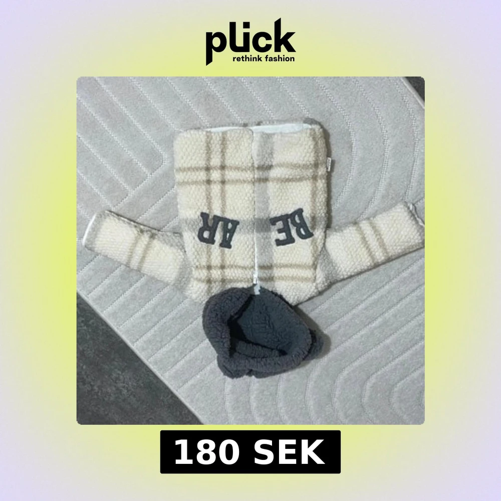 Säljer en mysig teddyjacka i beige med rutigt mönster och mörkgrå huva. Jackan har dragkedja framtill och coola bokstäver på bröstet. Perfekt för dig som gillar chill och varm stil.