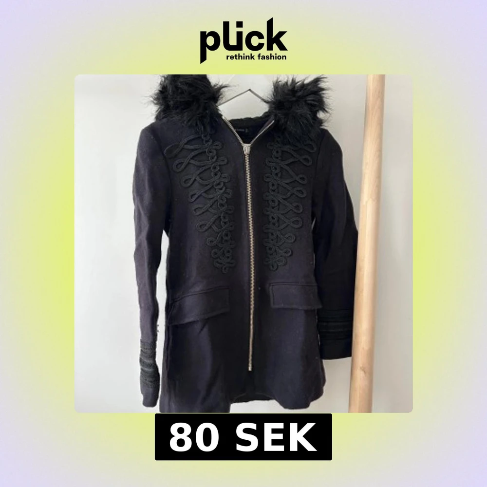 Svart kappa från Zara Woman med snygga dekorativa band framtill och dragkedja. Stor huva med fluffig fuskpäls och två fejk fickor. Ärmarna har detaljer och kappan är i ett mjukt ull-liknande material. Passar som S.