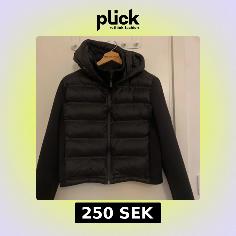 Säljer en svart pufferjacka med huva och dragkedja framtill. Jackan har quiltad kropp i glansigt material och släta svarta ärmar. Perfekt för kyliga dagar och har en clean, modern look.