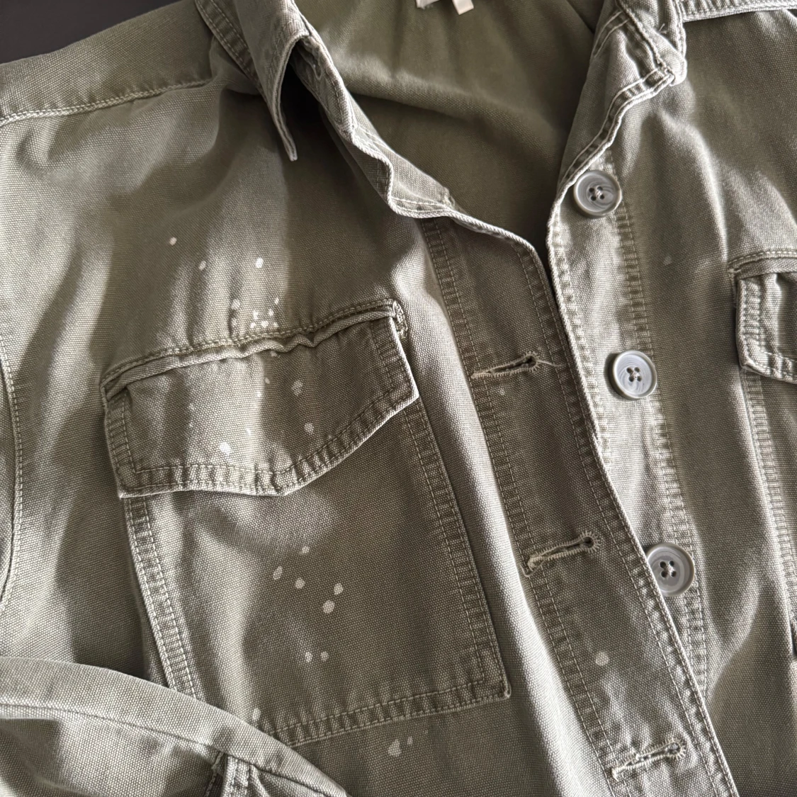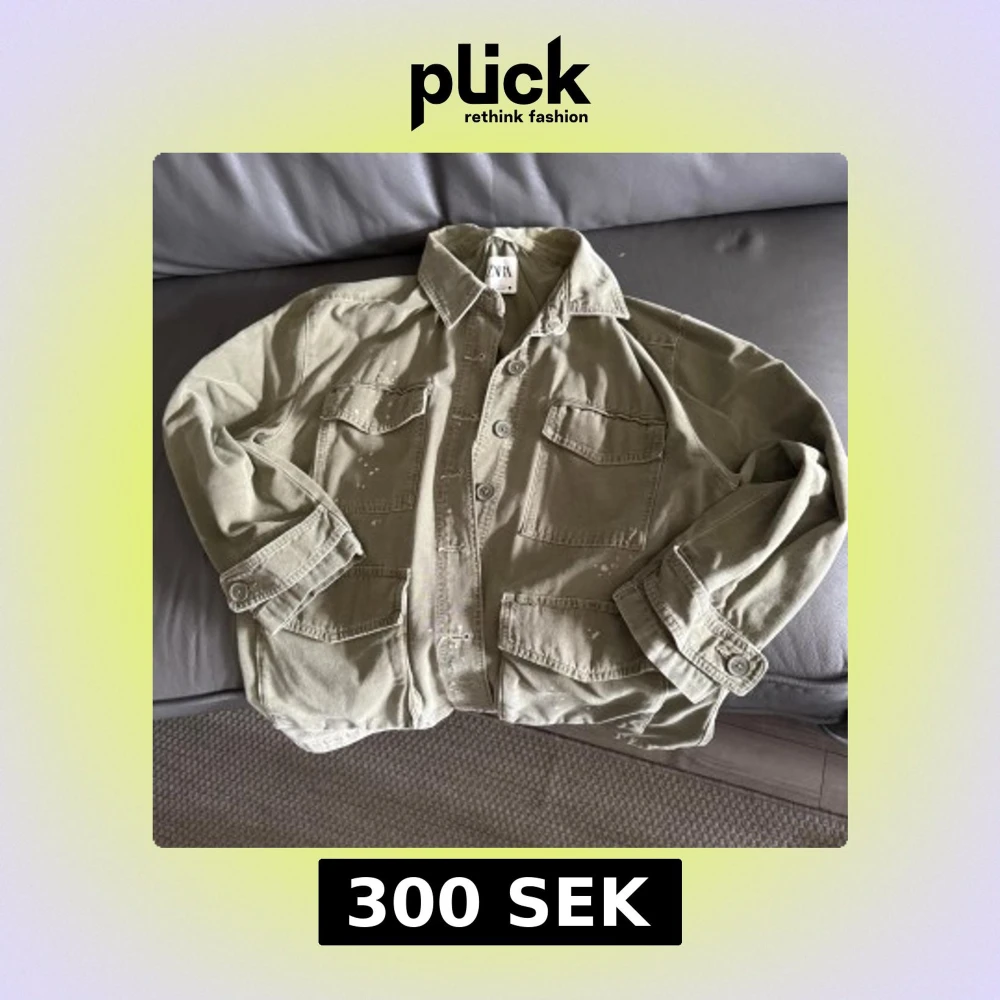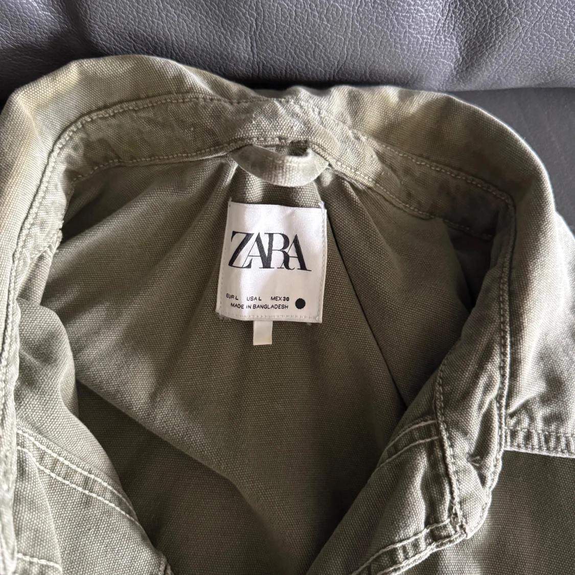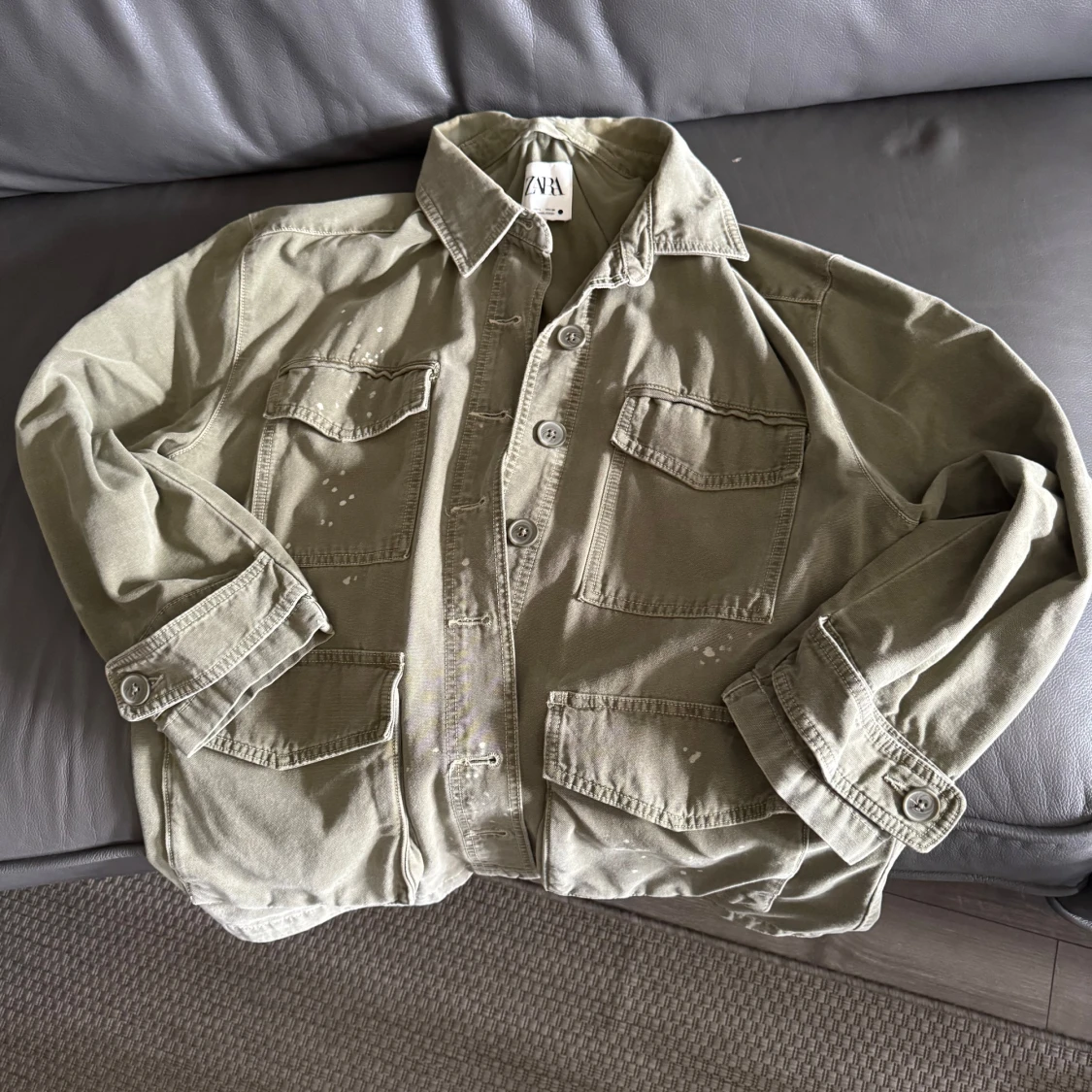 Olivgrön overshirt från Zara med fyra stora fickor framtill och coola knappar. Snygga vita färgstänk ger en unik touch. Stor i storleken och använd max 4 gånger