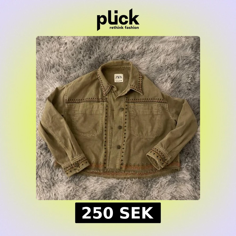 Säljer en olivgrön jacka från Zara med broderade detaljer längs krage, ärmslut och nederkant. Jackan har en avslappnad passform och knappar framtill. Perfekt för en bohemisk stil.